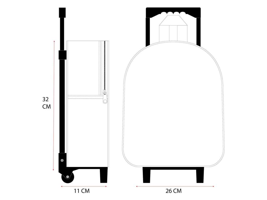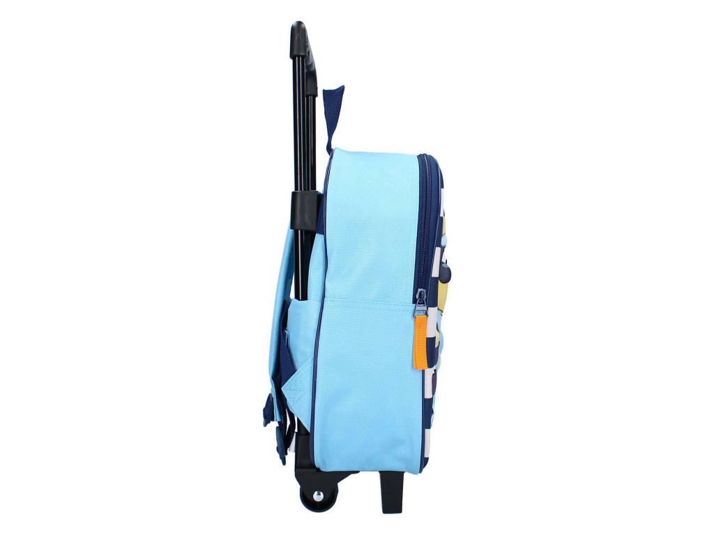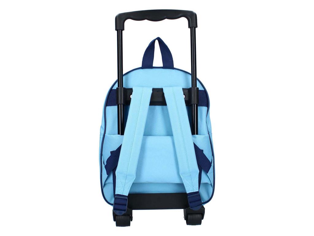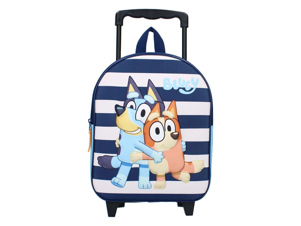 Ez a trolley az Oh Happy Days kollekcióból tökéletes minden Bluey rajongó számára! Kék-fehér színű, elülső zsebén Bluey és Bingo nagy nyomtatott képe látható. A főrekesz elegendő helyet kínál higiéniai cikkek, játékok és fürdőruha tárolásához. A tetején található fogantyú lehetővé teszi a kézben való hordozást. A fogantyú kihúzható. A kerekeknek köszönhetően a trolley kényelmesen húzható magad után.