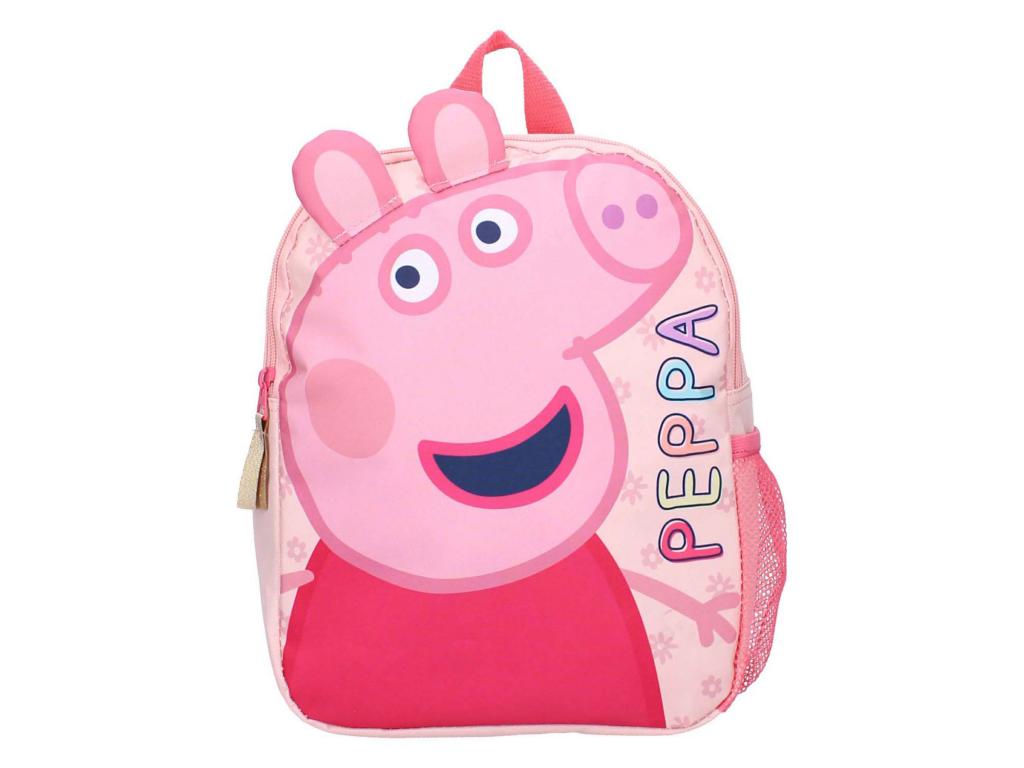 Ez a Peppa Malac hátizsák a Fluffy Friends kollekcióból kötelező darab minden Peppa rajongó számára. Ez a 3D-s táska rózsaszín, elbűvölő virág- és pillangó mintákkal. A nagy Peppa Malac nyomtatvány a táska teljes elülső részét borítja. A hátizsák tágas elülső zsebbel rendelkezik, és praktikus cipzárral záródik. A tetején található praktikus fül megkönnyíti a hordozást. A vállpántok állíthatóak, így a táska tökéletesen illeszkedik. Ezzel a Peppa Malac hátizsákkal garantáltan vidám és praktikus kiegészítőt talál!
