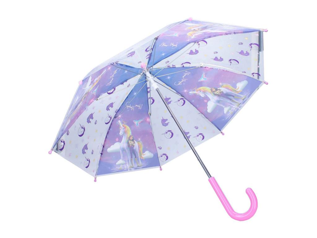 Az Unicorn Academy esernyő a tökéletes társ az esős kalandokhoz! Ez az elbűvölő esernyő kifejezetten a fiatal Unicorn Academy rajongók számára készült, akik szárazon szeretnének maradni, miközben egy kis varázslattal színesítik a napjukat. Az átlátszó kialakításnak köszönhetően a gyerekek még zuhogó esőben is szabadon láthatják a környezetüket. A robusztus kialakítás biztosítja, hogy az esernyő ellenálljon a szélnek és az erős igénybevételnek, míg a pasztell színek és a csillogó egyszarvú részletek varázslatos megjelenést kölcsönöznek neki. A gyönyörű egyszarvú és csillogó csillag motívumok igazán vonzóvá teszik ezt az esernyőt. A kényelmes fogantyú és az egyszerű nyitó- és zárómechanizmusnak köszönhetően ez az esernyő ideális kis kezek számára. Nagyméretű átmérőjének köszönhetően kiváló esővédelmet nyújt, így a gyerekek szárazon maradnak az iskolába vezető úton, egy egynapos kiránduláson vagy egy esős játéknapon. Az Unicorn Academy esernyő ötvözi a funkcionalitást a fantáziával, és minden gyerek arcára mosolyt varázsol. Bővítsd gyűjteményedet ezzel a varázslatos esernyővel, és varázsold minden esős pillanatot mágikus kalanddá!