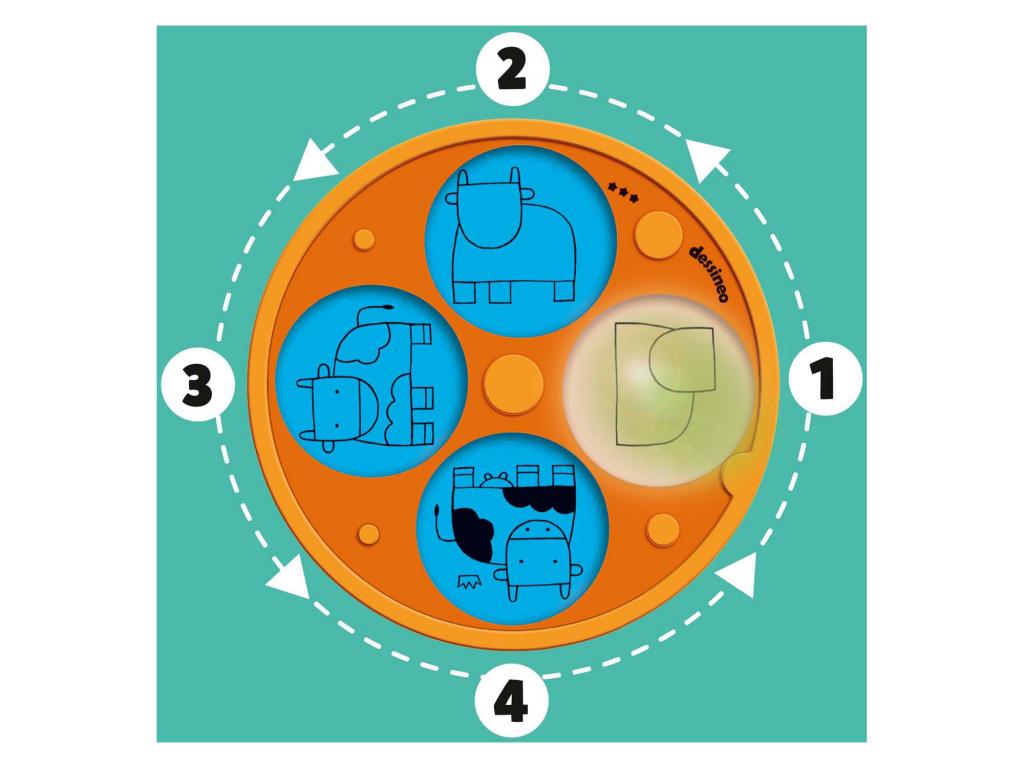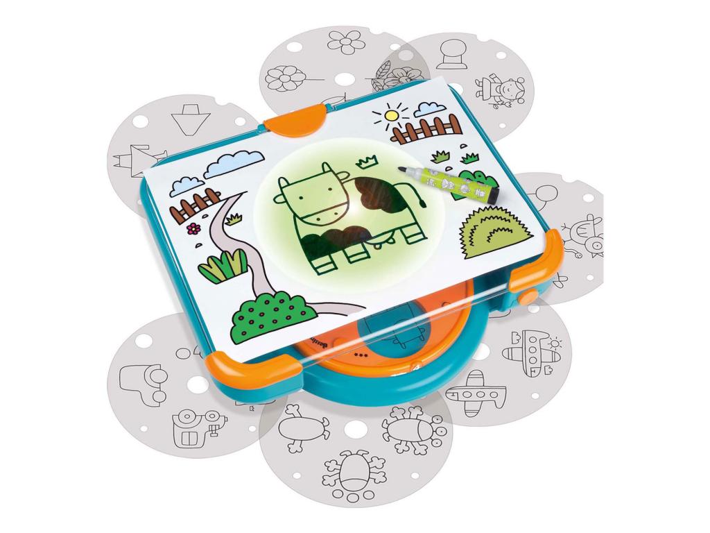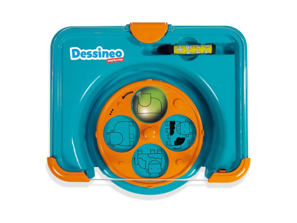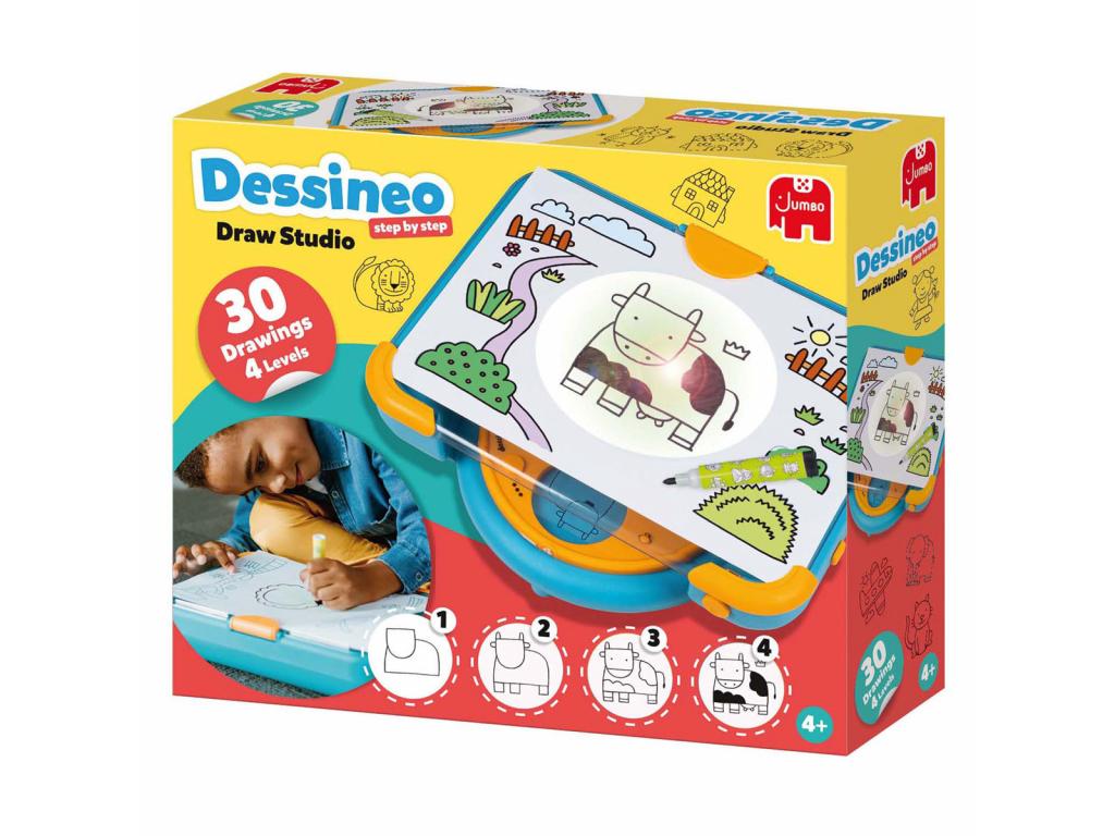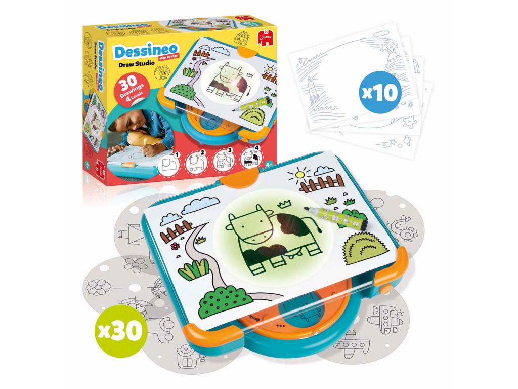 Készítsd el a legszebb rajzokat a Jumbo Dessineo segítségével! A Dessineo kifejezetten 4 évesnél idősebb gyermekek számára készült. A gyermek egyszerű és játékos módon, lépésről lépésre tanulja meg a rajzolást. Hogyan működik? Válassz ki egy átlátszó sablonlemezt, és helyezd a forgótányérra. Kapcsolja be a projektort, forgassa el a lemezt az 1. lépésre, és rajzolja át a vonalakat egy filccel. Ezután forgassa el a forgógombot a 2., 3. és 4. lépésre. A sablonok nehézségi foka növekszik. A rajztáblában minden áttekinthetően elhelyezhető. Tartalom: 1 rajztábla fogantyúval 30 rajz sablon 1 fekete filctoll 10 A4-es háttérlap Útmutató