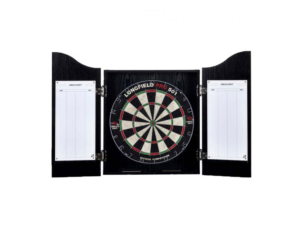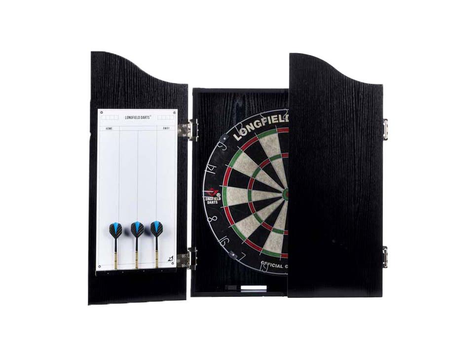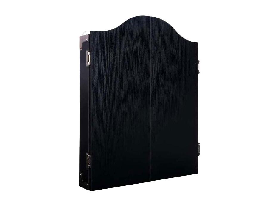 Fekete színű, fából készült darts szekrény. Sisal darts táblát, 6 db sárgaréz darts nyilat (18 gramm), jelölőt és radírt tartalmaz.