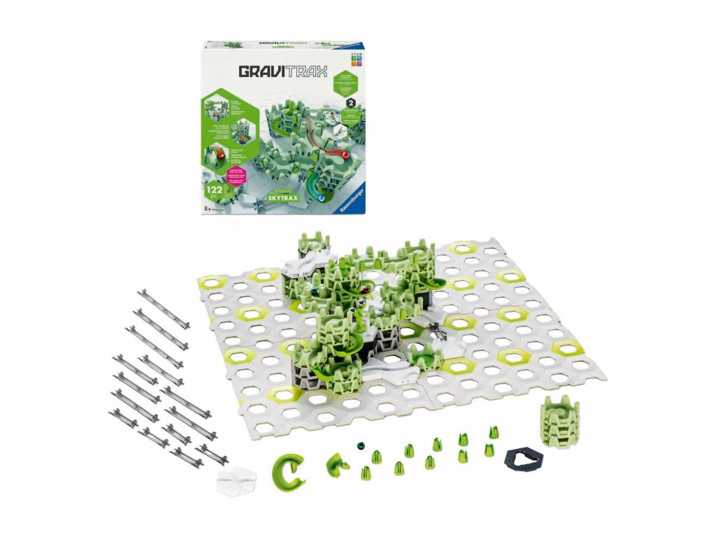 GraviTrax Skytrax kezdő szett több mint 100 műanyag alkatrésszel, köztük csúszdákkal, emelt elemekkel, sínekkel és golyókkal. Kompatibilis más GraviTrax szettekkel. 8 éves kortól alkalmas.