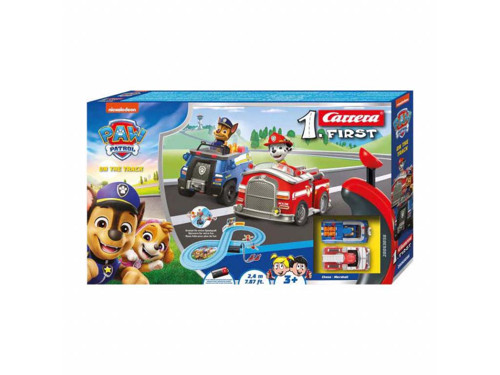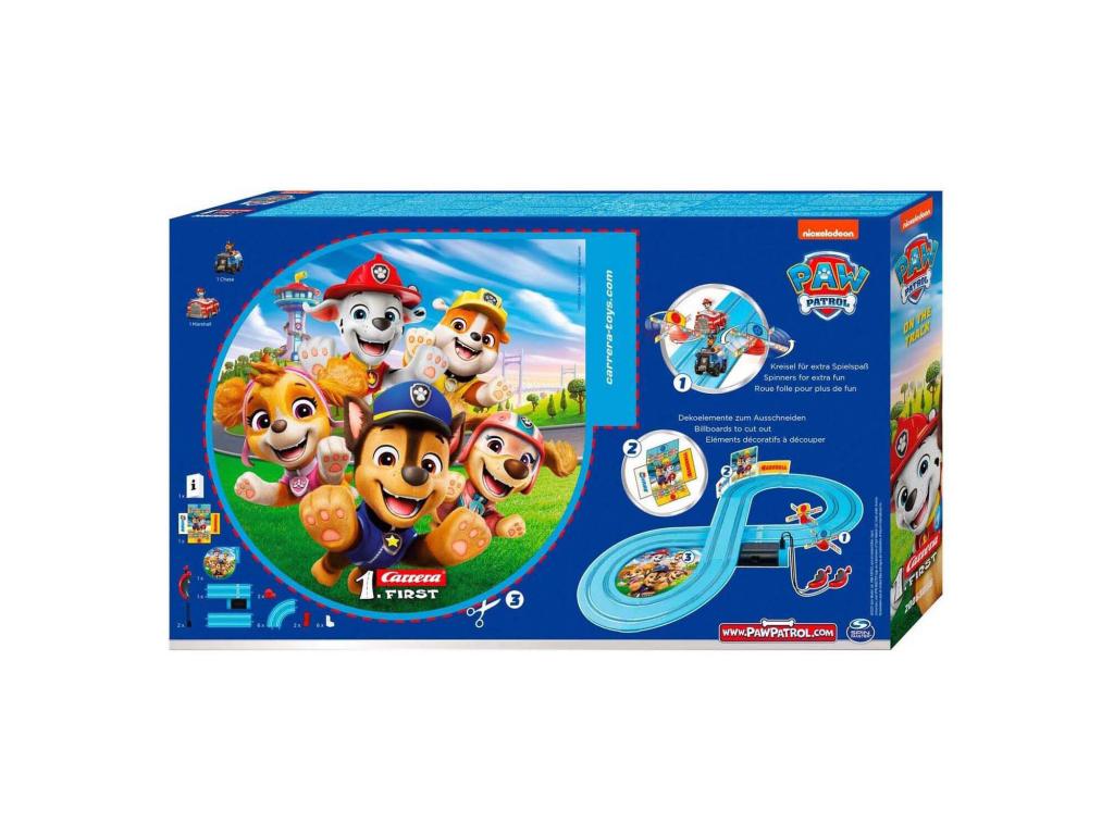 Készen áll a mentőakcióra: indul a Mancs Őrjárat! Mostantól a kis versenyzők a bátor kutyákkal, Chase-szel és Marshall-lal együtt kalandozhatnak. A Carrera FIRST Mancs Őrjárat On the Track játéktér a Mancs Őrjárat hőseit közvetlenül a gyerekszobába hozza. A 2,4 méter hosszú pályán Chase és Marshall mentőautóikkal izgalmas kanyarokban, gyors egyenesekben és trükkös szakaszokban száguldanak. Egy vicces körforgás további izgalmat biztosít, és a gyerekek közelről tapasztalhatják meg, milyen is részese lenni egy mentőakciónak.
