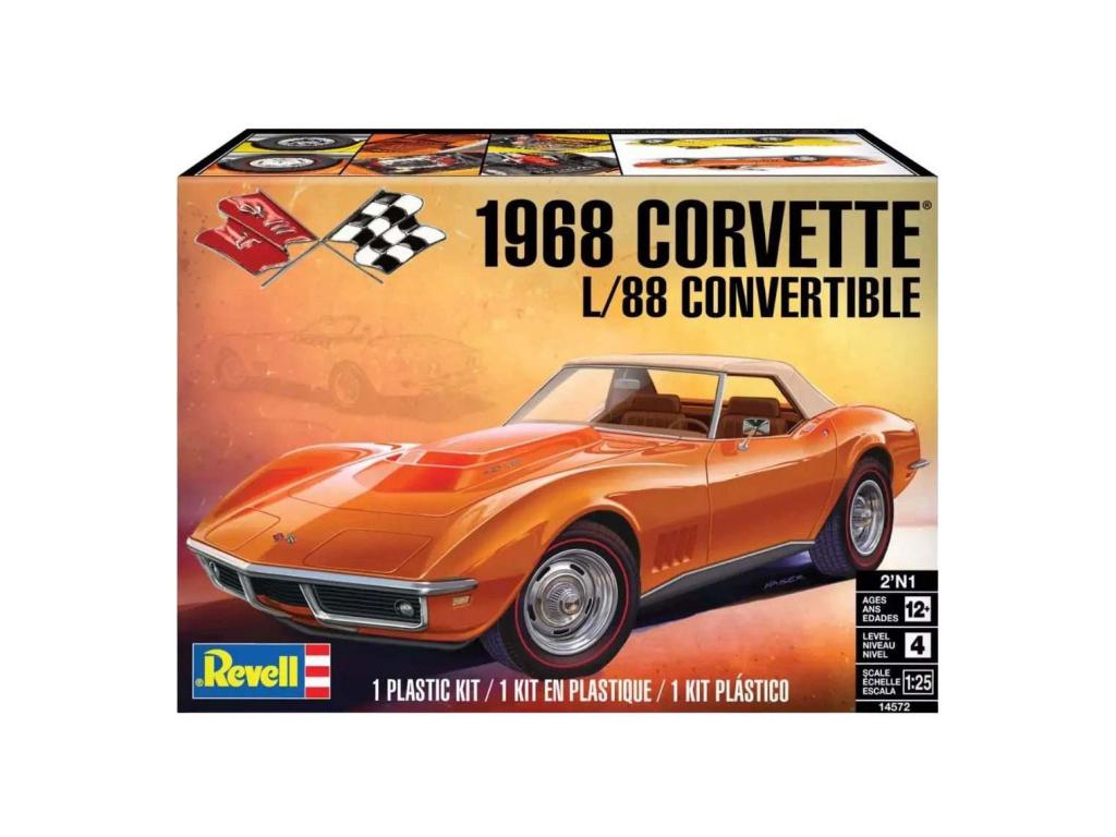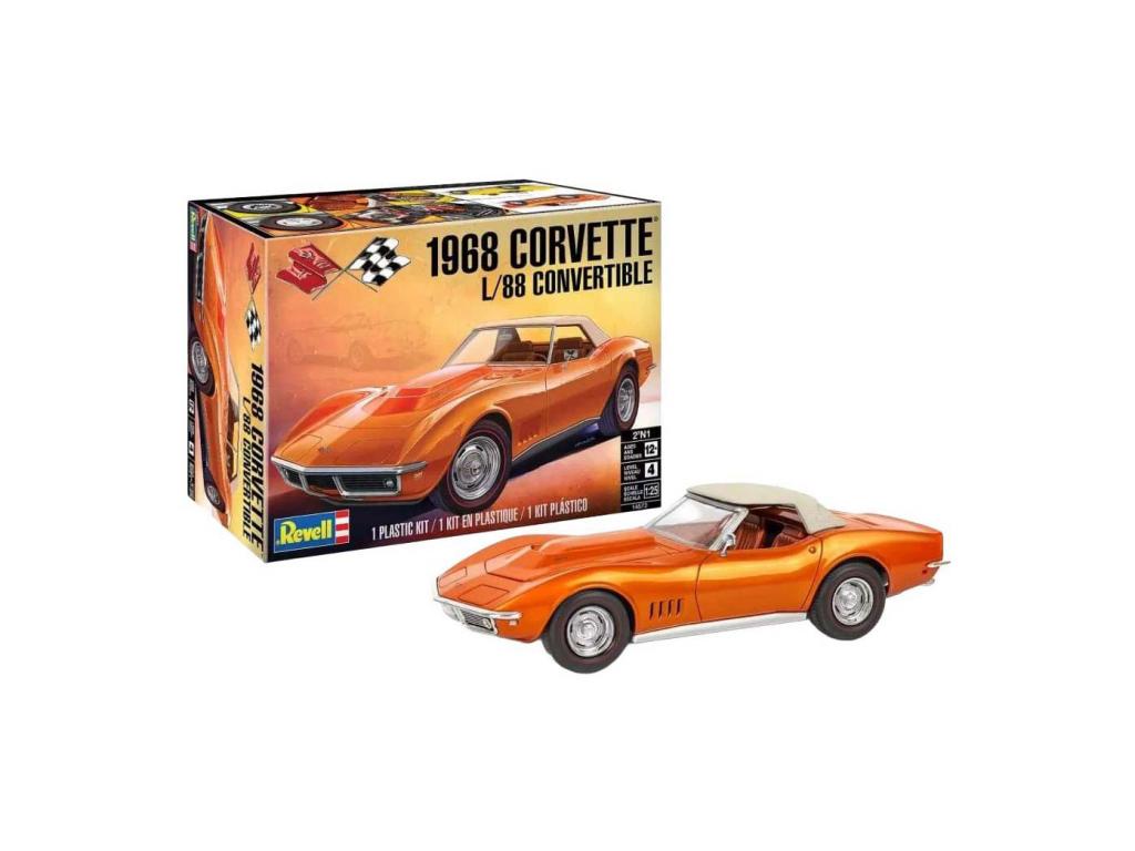 Részletes Revell modellező készlet a 1968-as Corvette L-88 Roadsterről 1:25 méretarányban. Tartalmaz egy 427-es V8-as motort, egy levehető keménytetőt vagy kabriótetőt, valamint alkatrészeket standard vagy speciális kivitelhez. Realisztikus matricákkal és Redline gumiabroncsokkal.