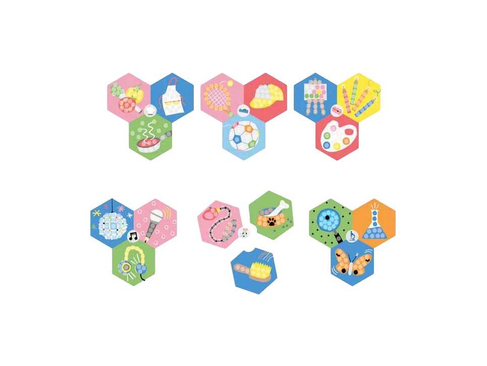 Fedezd fel kedvenc hobbijaidat és érdeklődési köreidet ezzel a hat színes sablonkészlettel. A zenétől a sportig színes motívumokat, például mikrofonokat, fejhallgatókat és diszkógömböket ragaszthatsz, rendezhetsz és kombinálhatsz.