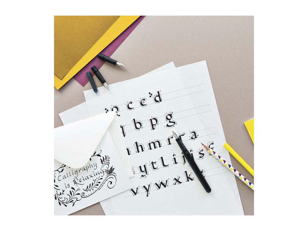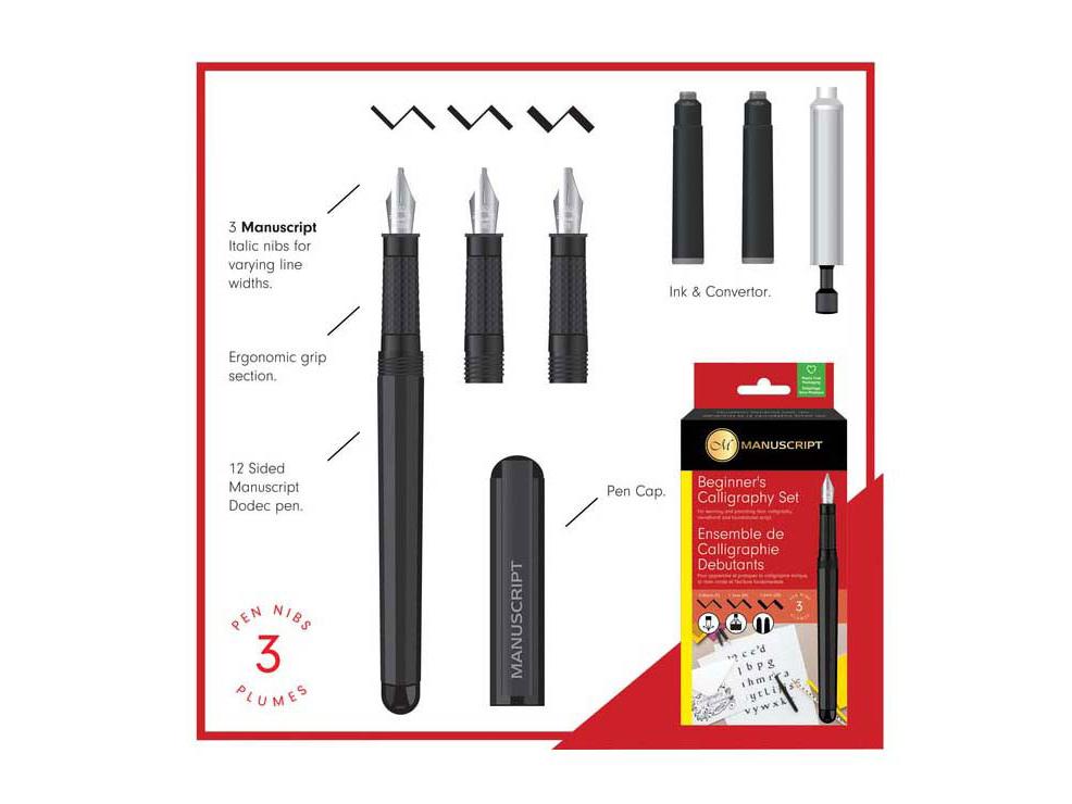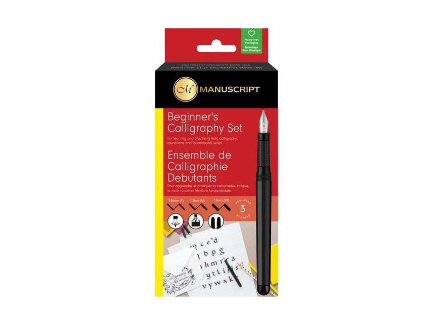 Kalligráfia-készlet kezdőknek és haladóknak. Tartalmaz 1 tolltartót, 1 tintapatront és 3 tollhegyet a következő írásvastagságokkal: F (0,85 mm), M (1,1 mm) és 2B (1,6 mm).