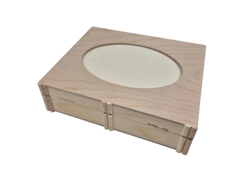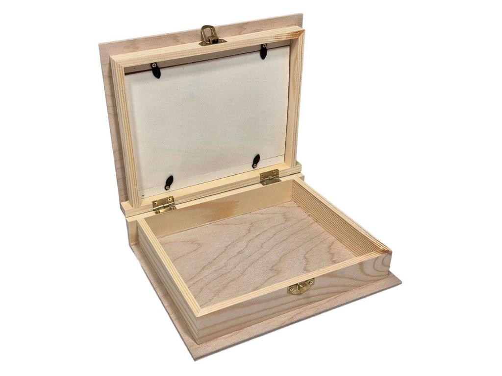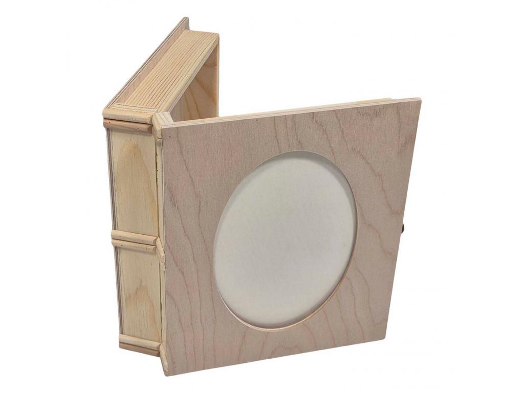 Fából készült, könyv formájú doboz fotókerettel a fedélben. A doboz méretei: 21,8 x 18,3 x 5,7 cm, fenyőfából készült.