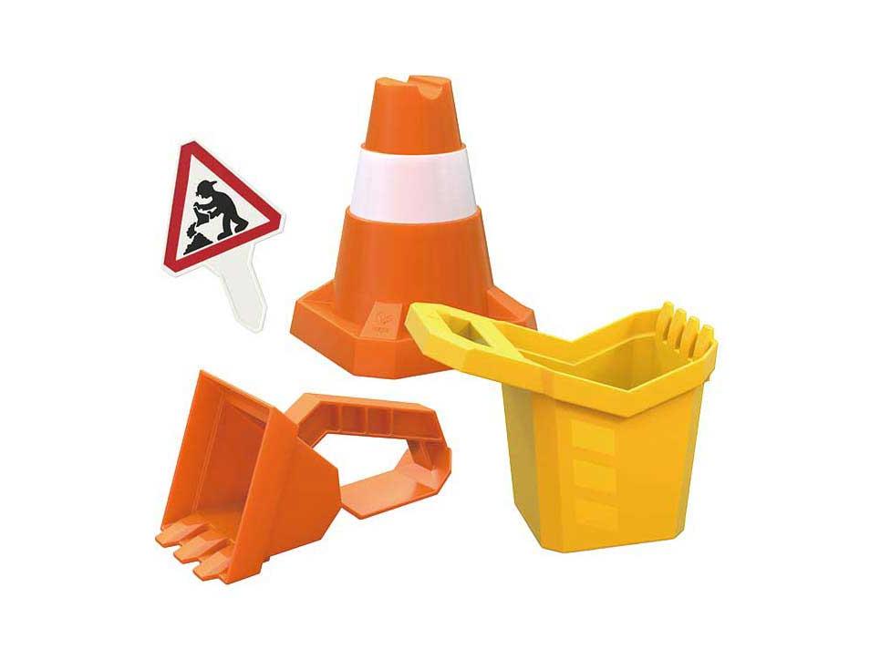 Stabil homoklapát és vödör építkezéses dizájnban. Tartós műanyagból, tökéletes homokozóba, strandra vagy kertbe. 3 éves kortól alkalmas.