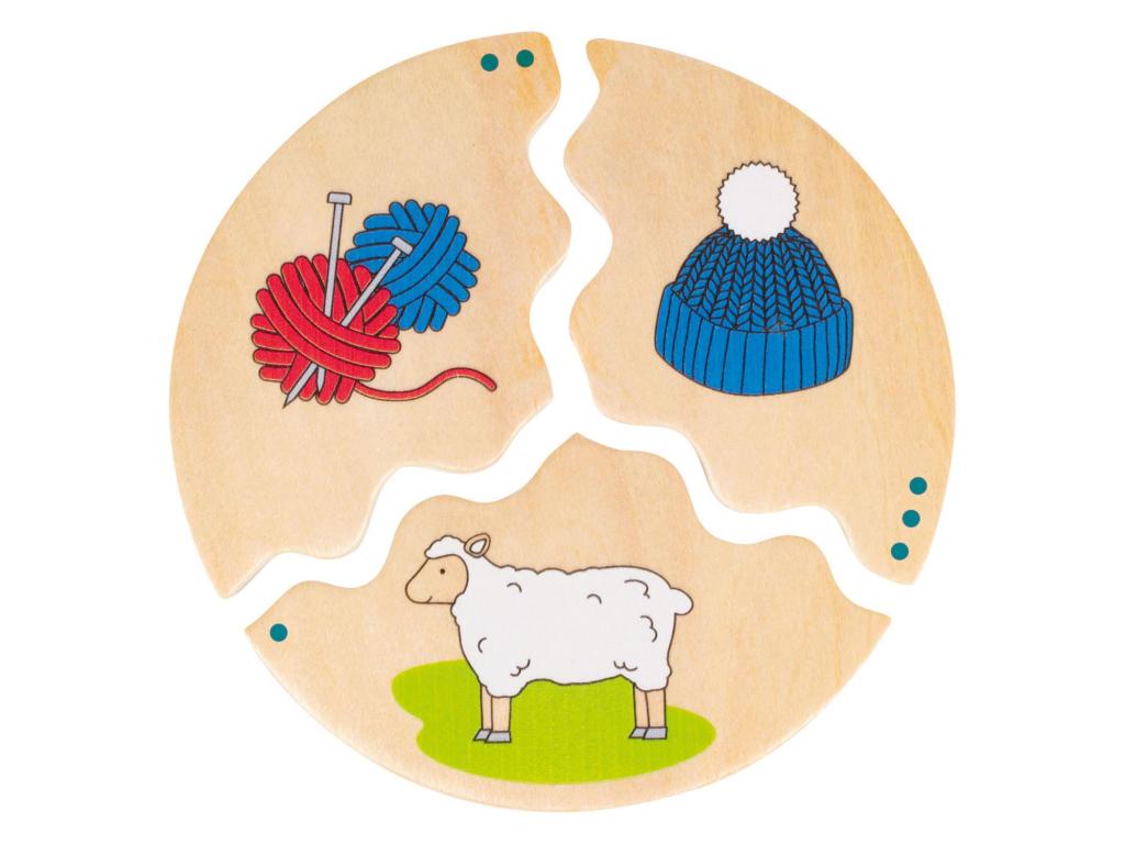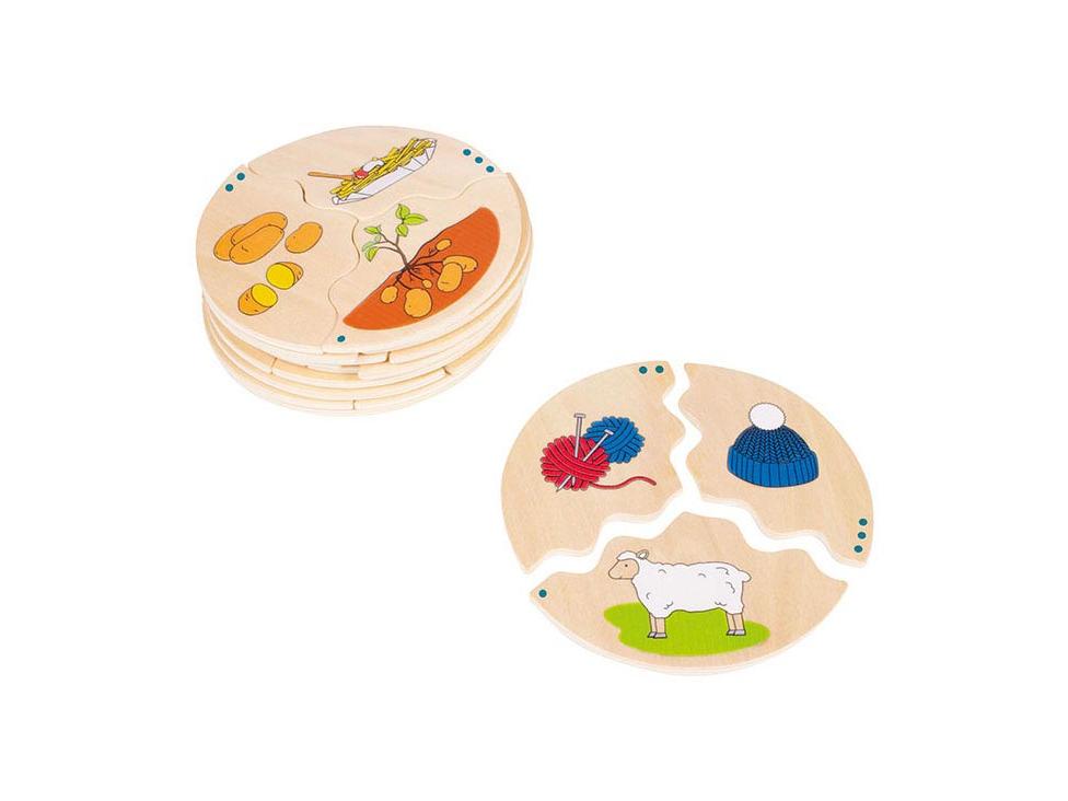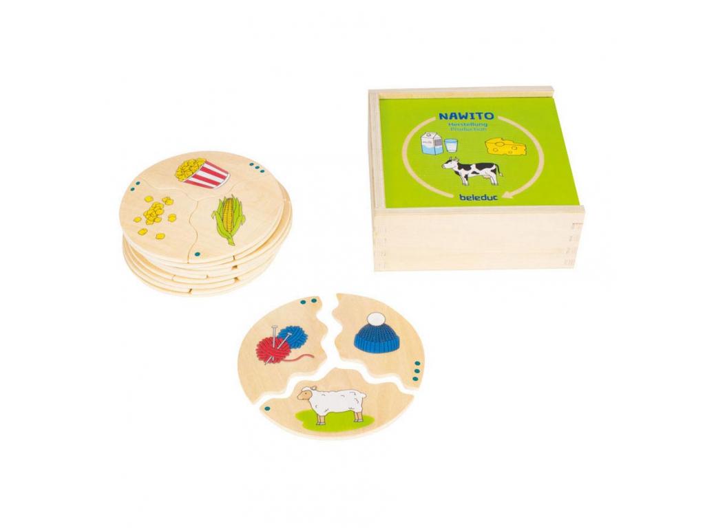Ez a 3 részes puzzle elősegíti a logikai összefüggések felismerését és a termékfeldolgozás és -gyártás folyamatainak megértését. 30 darabból áll (10 puzzle). 4 éves kortól alkalmas.