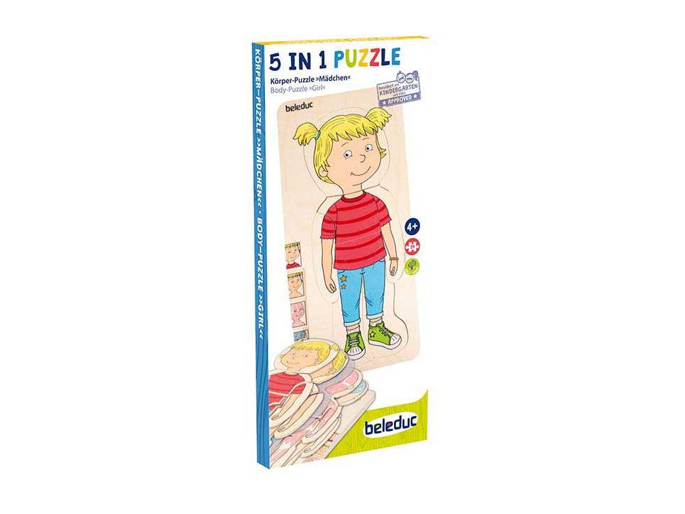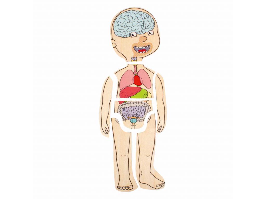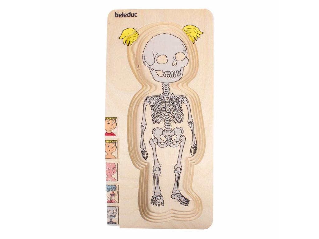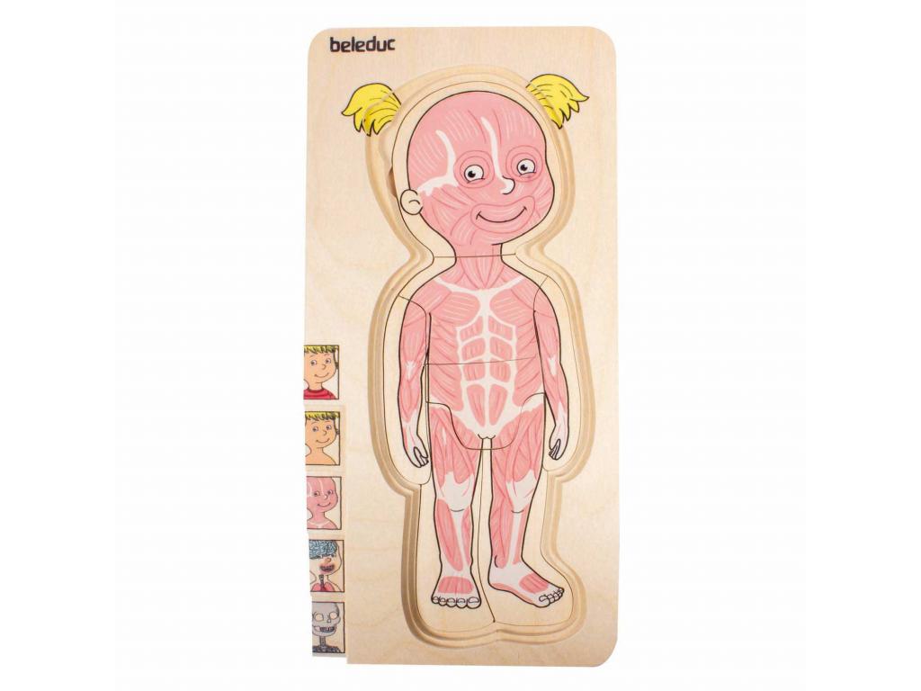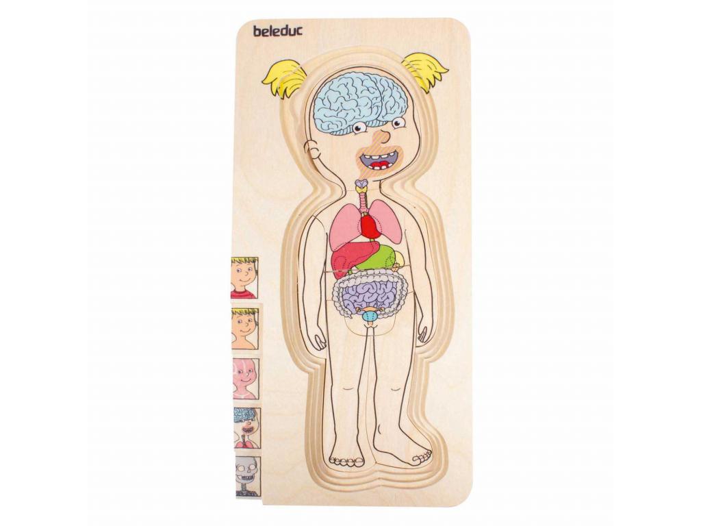 Fa réteges puzzle egy lány testéről 5 réteggel: ruházat, bőr, izmok, szervek és csontváz. Oktató és strapabíró. 4 éves kortól alkalmas.