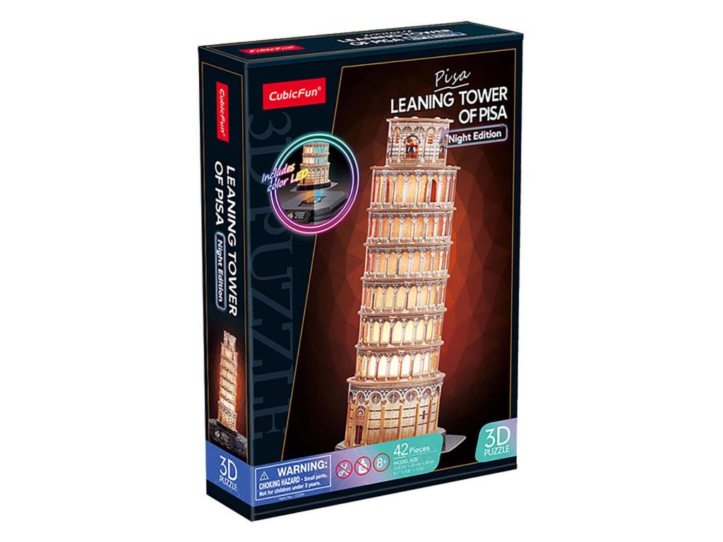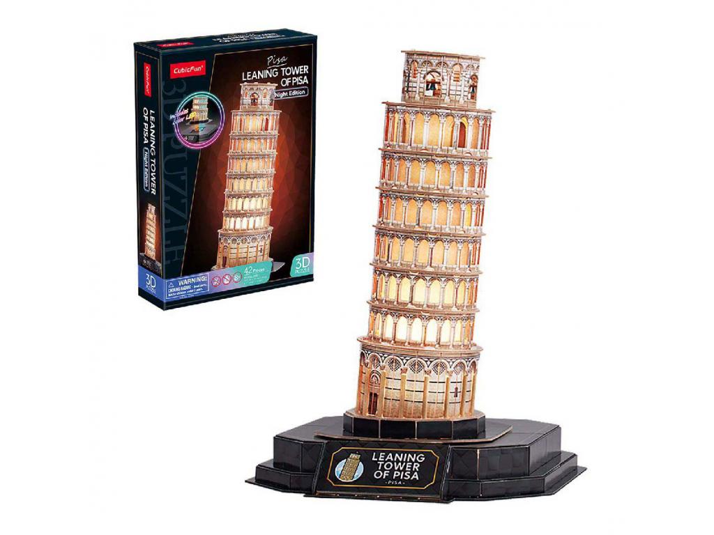 3D-puzzle Pisa tornya LED-es világítással. 42 darab, szerszám és ragasztó nélkül könnyen összeállítható. Az elemek nem tartozékok. Szép dobozban csomagolva. 8 éves kortól alkalmas.