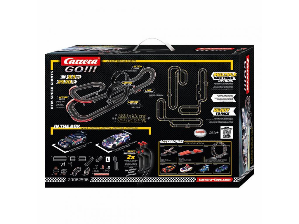 A Carrera GO!!! 8,9 m hosszú autóversenypálya GT3 Audi R8 LMS és Lamborghini Huracán autókkal, tartalmaz hurkot, ferde kanyart, függőleges falat, egyeneseket, kanyarokat, körszámlálóval ellátott részt és egyéb alkatrészeket. Képzeleted szerint további különböző pályákat is összeállíthatsz. A leghosszabb GO!!! szett