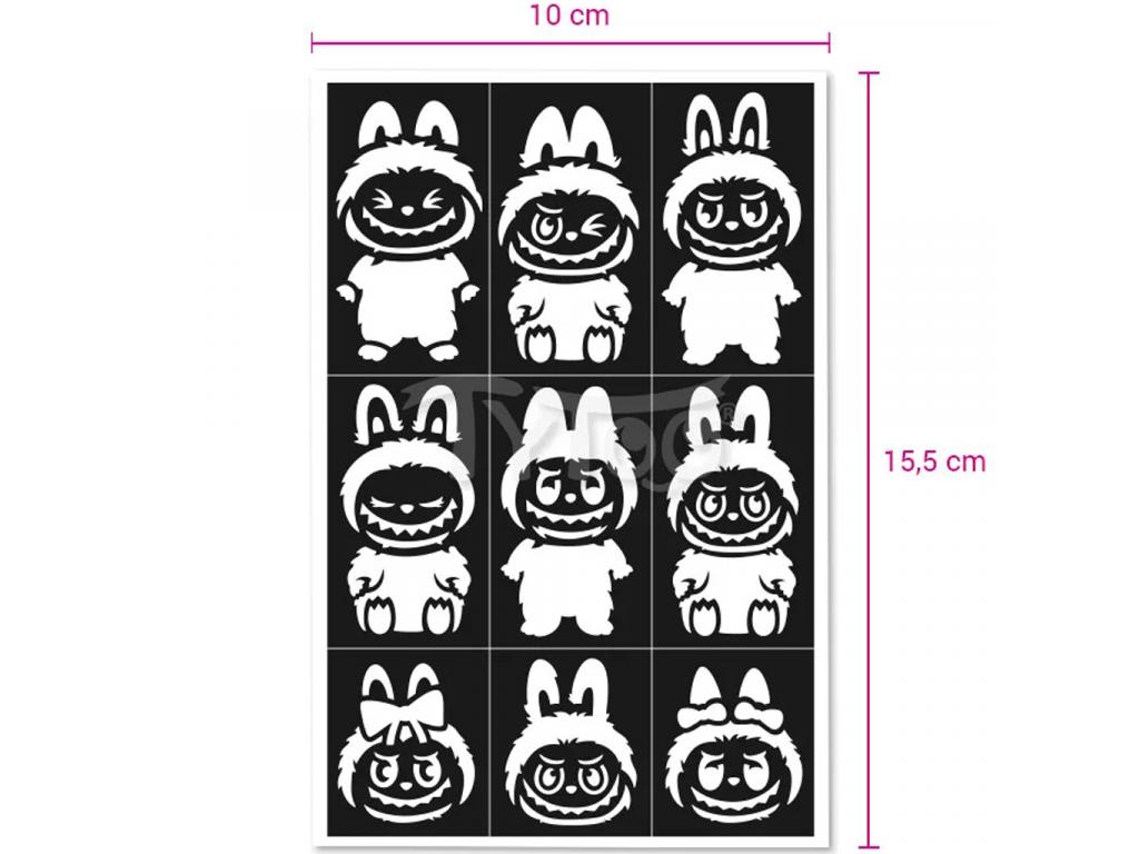 Ha a gyermeked szereti az egyedi, kicsit mókás, kicsit vagány karaktereket, akkor a TyToo Labubu csillámtetoválás sablon szett garantált kedvence lesz! Ez a 9 darabos sabloncsomag a népszerű, nyuszis jelmezbe bújt Labubu figurákat hozza el, akiket csillámporral díszítve igazi varázslatos tetkókká alakíthattok.
