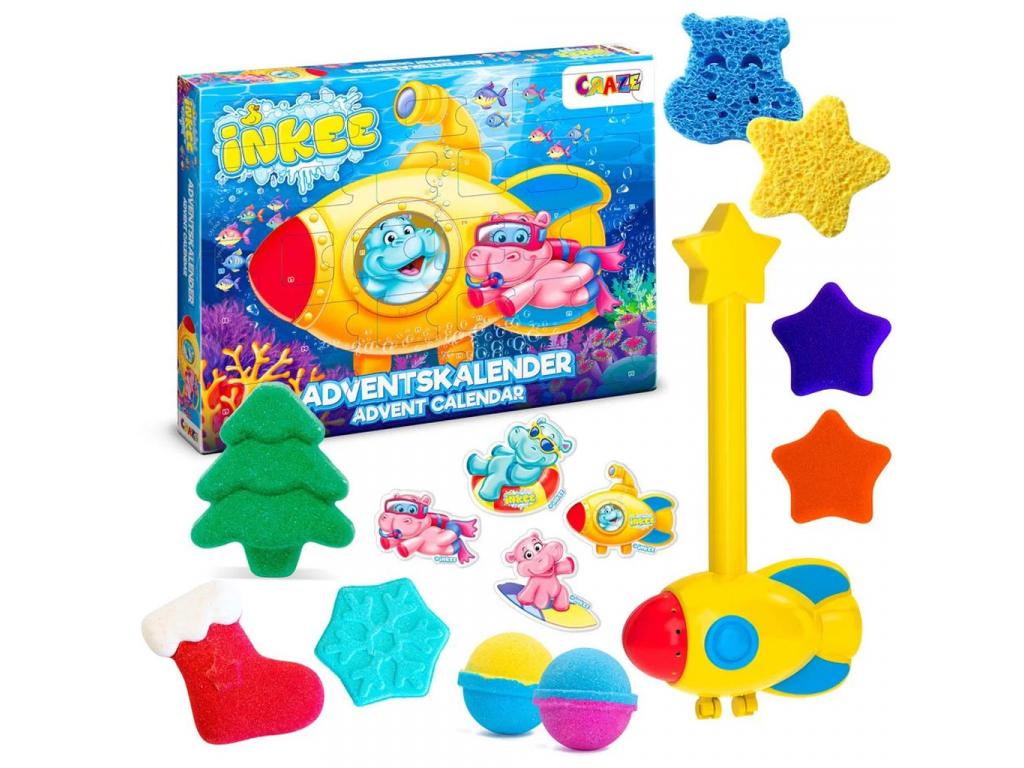 A Craze Inkee adventi naptár témája egy vidám, tengeralattjárós kaland, amelyben két kedves vízi figura egy kék és egy rózsaszín víziló vezeti be a kicsiket a habok birodalmába. Minden egyes nap egy újabb játék vagy kiegészítő bukkan elő, így a gyerekek nemcsak a karácsonyt várják izgatottan, hanem a fürdést is egyre jobban élvezik. A fürdőbombák finom illatukkal és színes habjukkal teszik varázslatossá a kádfürdőzést, a különböző formájú szivacsok pedig kreatív pancsolásra csábítanak.
