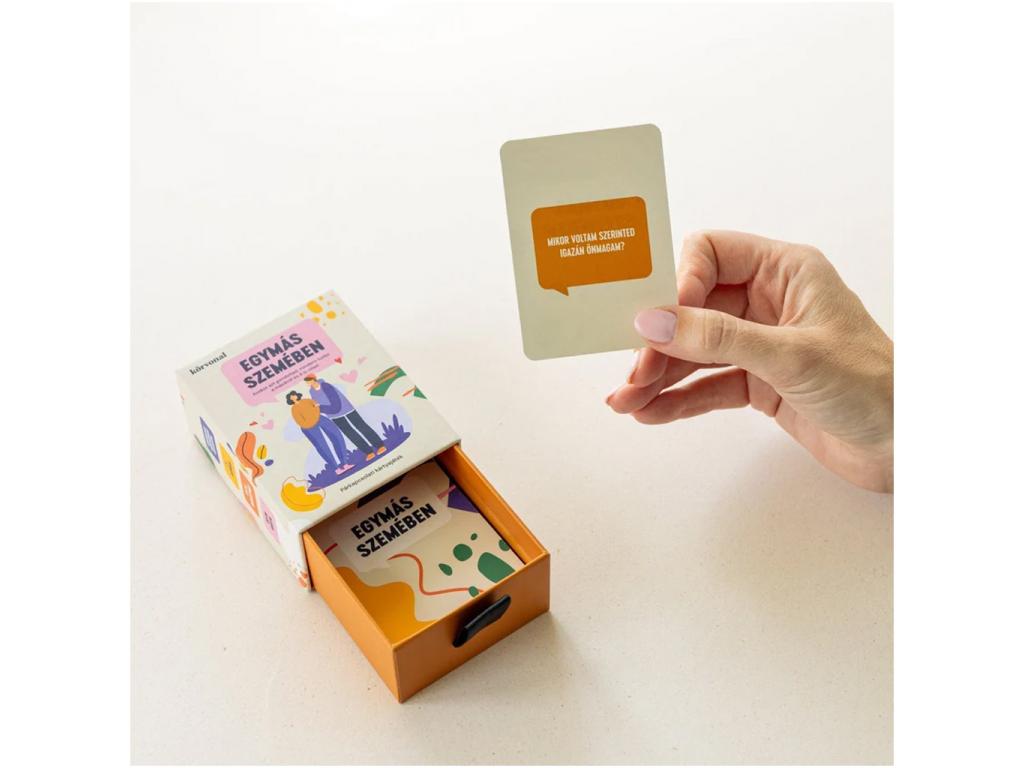 A játék kérdései több szinten mozognak: vannak könnyed, játékosabb lapok, de sok mély, őszinte beszélgetést inspiráló kártya is vár rátok. Mikor voltam szerinted igazán önmagam? ilyen és ehhez hasonló kérdések segítségével nyílik lehetőségetek arra, hogy elmondjátok egymásnak azt, amit talán már régóta éreztek, de sosem mondtátok ki.