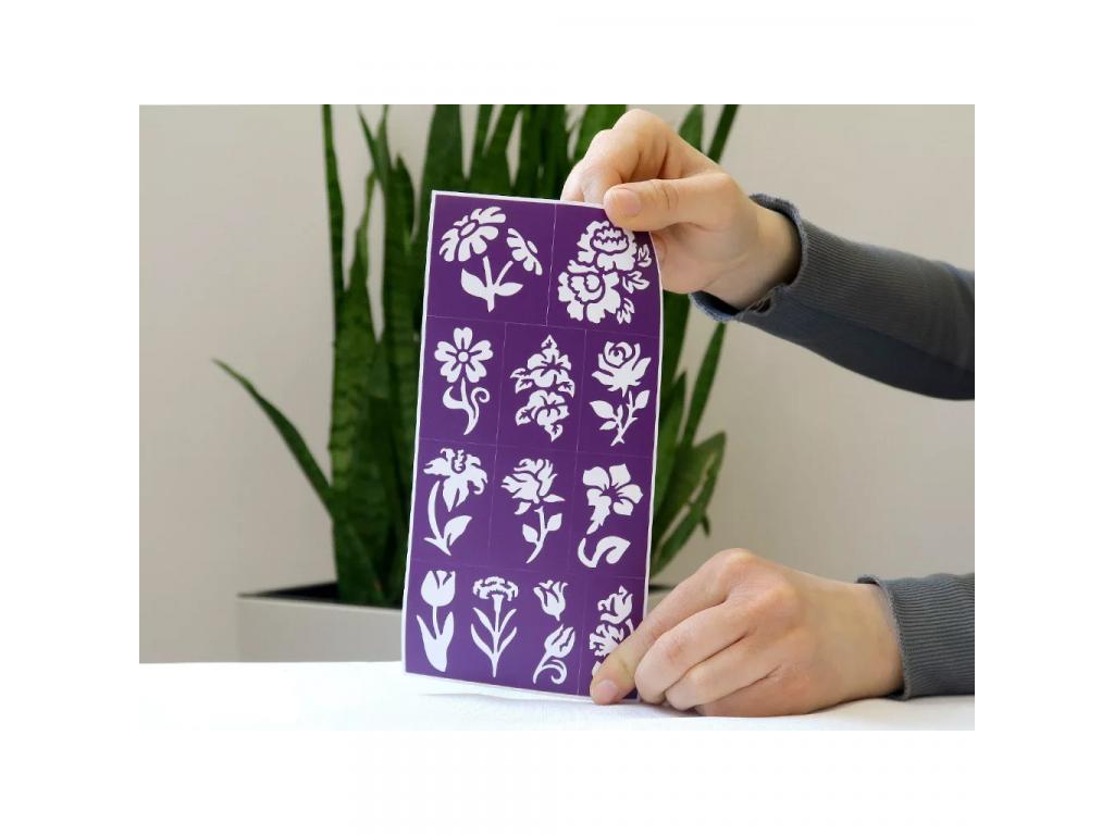 A sablonok öntapadósak, így biztosan a helyükön maradnak, amíg a csillámtetoválás elkészül. A használat egyszerű és biztonságos, a kisebb gyerekek is könnyedén boldogulnak vele egy kis segítséggel akár önállóan is elkészíthetik saját virágos mintáikat. Csak válassz egy sablont, simítsd fel a bőrre, kend rá a ragasztót, majd szórd meg csillámporral és máris kész az egyedi virágdísz!