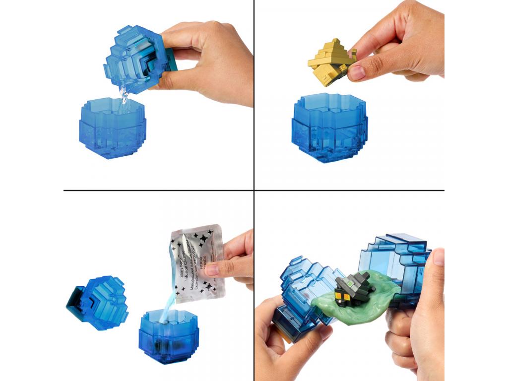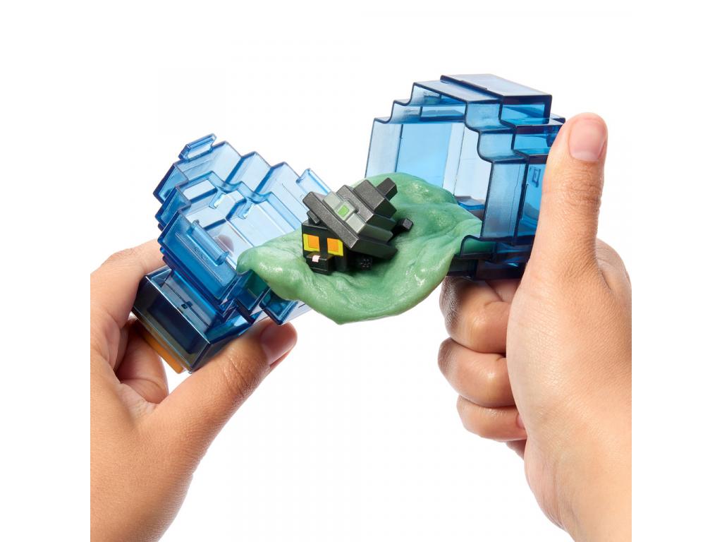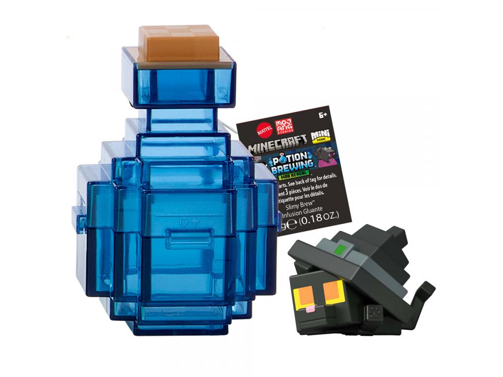 A szett egy áttetsző kék bájitalos flaskát tartalmaz, benne egy rejtett figura, valamint egy adag Slimy Brew slime port. A játék menete igazi élmény: először vízzel kell megtölteni a flaskát, majd beleszórni a slime port, végül beledobni a titkos figurát. Néhány mozdulat után a keverék életre kel, és előtűnik egy jól ismert karakter a Minecraft világából ezúttal egy varázsló kalapot viselő fekete macska, látványos, kockás részletekkel és színváltós effektussal!