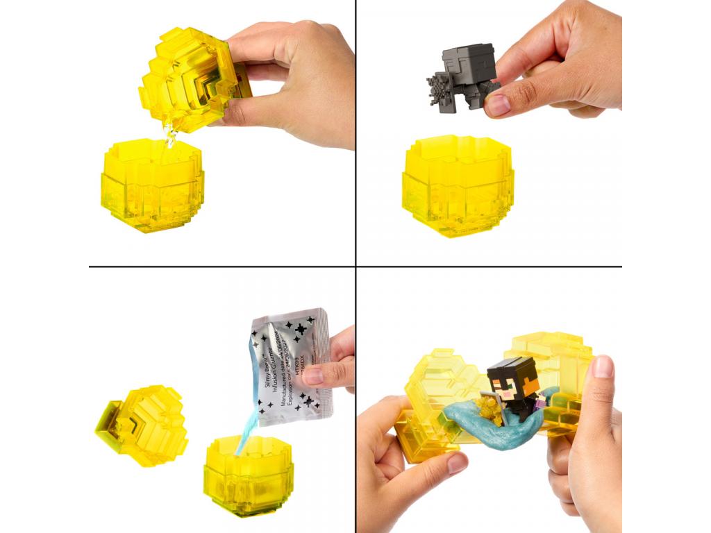 A csomag egy áttetsző, Minecraft stílusú bájitalos üveg alakú tartályt, egy titkos figurát és egy adag Potion Particles slime port rejt. A gyerekek egyszerűen csak vizet öntenek a tartályba, hozzáadják a port, majd erősen összerázzák és máris kezdődhet a mágikus átváltozás! A kezdetben egyszínű, szürke figura előtűnik teljes dicsőségében, ahogy a slime és víz kombinációja feltárja valódi színeit és részleteit.