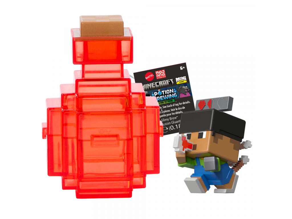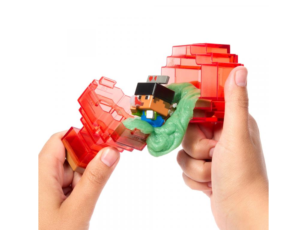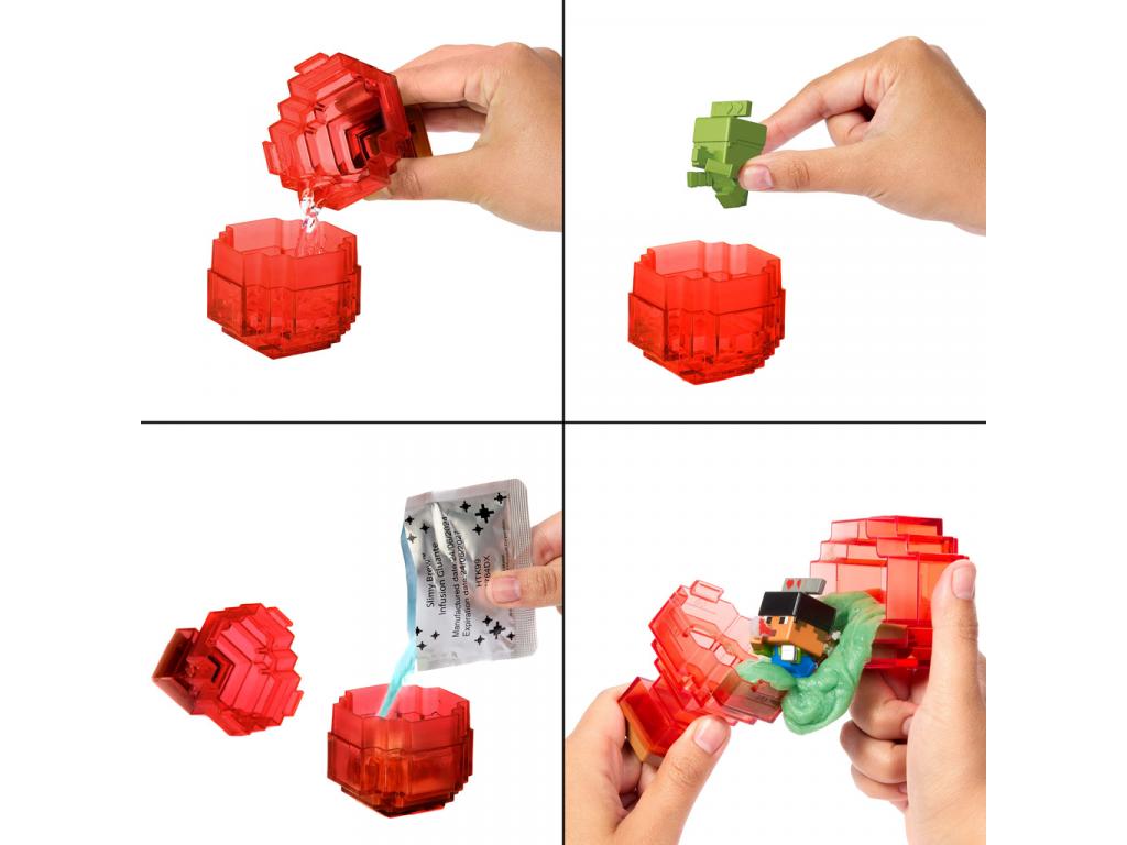 A szett egy ikonikus piros bájital formájú konténerrel érkezik, amely egy slime keverékkel és egy szürke, titkos figurával van feltöltve. A gyerekek vizet öntenek a tárolóba, belekeverik a slime port, majd beledobják a figurát. Néhány rázás után a slime felfedi a valódi karaktert ezúttal egy Minecraft figura, aki épp gyógyító bájitalt iszik, miközben a feje fölött életcsík (szívecske) ikon jelenik meg. Ez az apró részlet igazán hű a játék világához, és különlegessé teszi ezt a darabot.