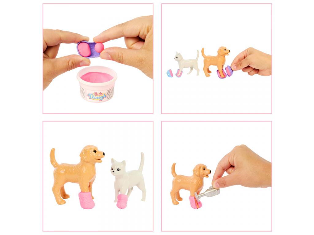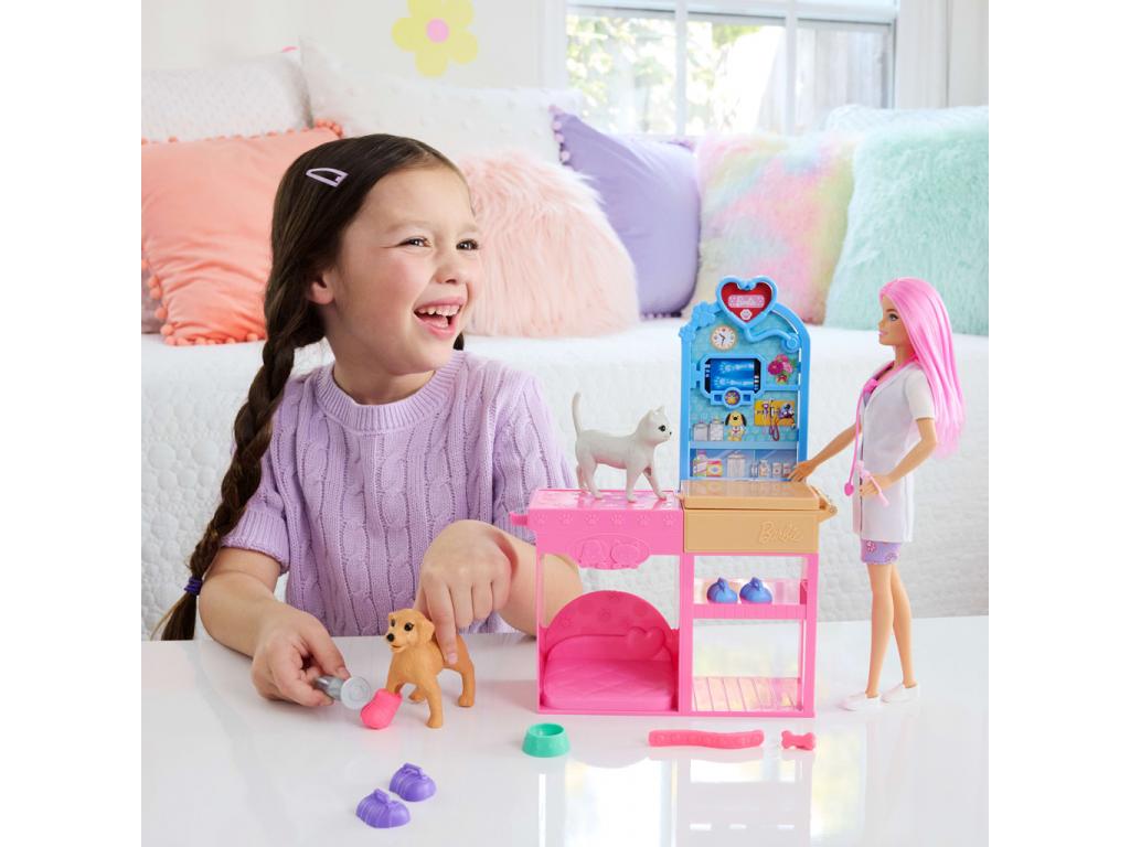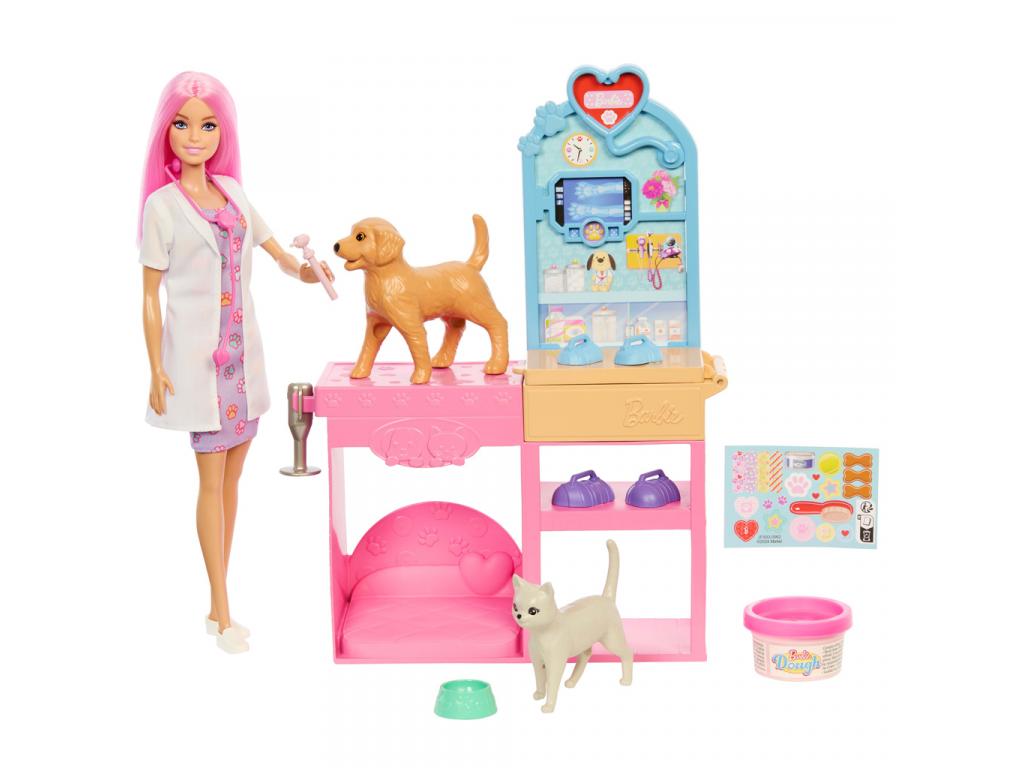 Barbie állatorvos stílusosan készen áll a segítségnyújtásra: rózsaszín mintás ruhában, fehér köpenyben és sportos cipőben érkezik, vidám rózsaszín hajával pedig minden gyermek szívébe azonnal belopja magát. A több mint 10 darabos szett rengeteg kiegészítőt tartalmaz: állatorvosi eszközöket, etetőtálat, gyurmát, matricákat, formákat mindent, ami a játékélményhez szükséges.
