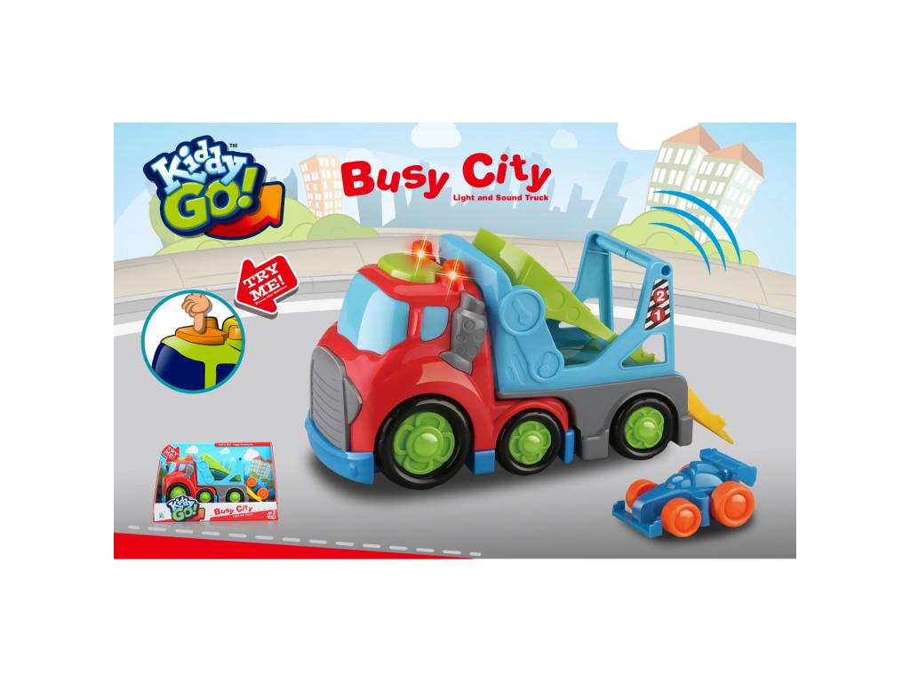 A Kiddy Go autószállító tökéletes kis autórajongók számára. 19,5 cm hosszú, valósághű fény- és hanghatásokkal rendelkezik, amelyek élethűvé teszik a játékélményt. A masszív műanyag szerkezetnek köszönhetően az autó ütésálló, ideális kisgyermekek intenzív használatához.