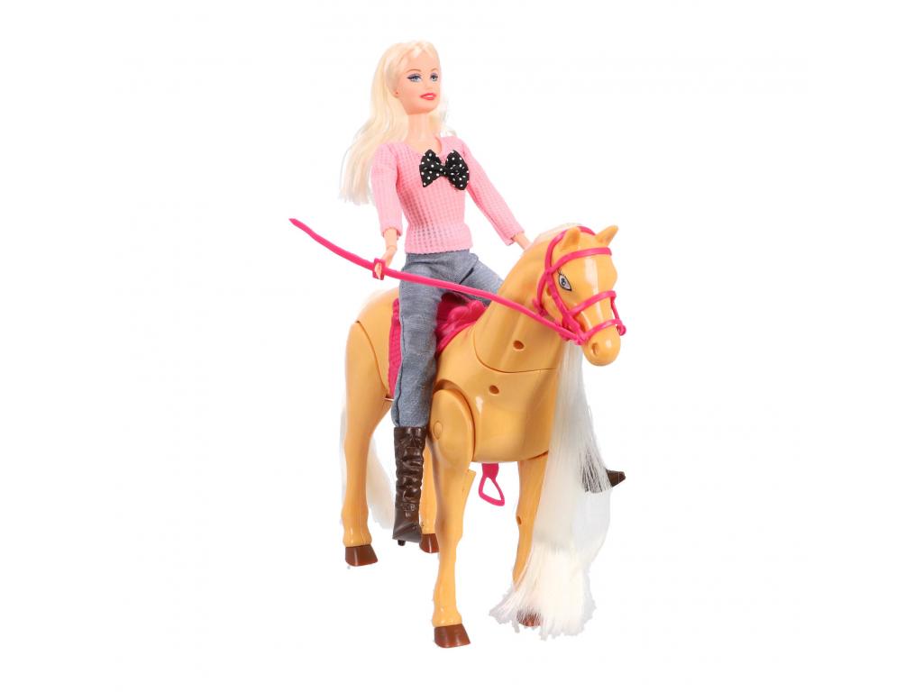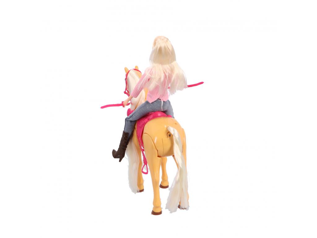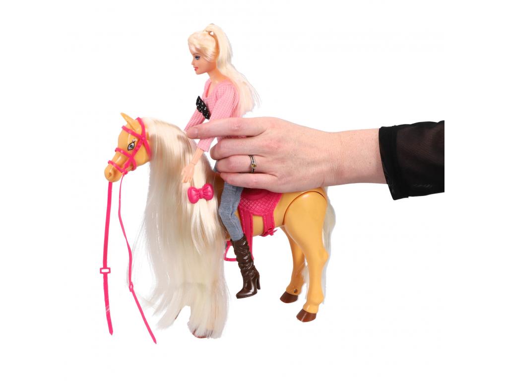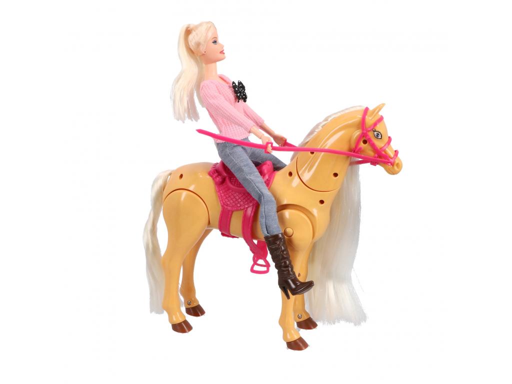 Igazi futó ló babával. Gyönyörű baba lóval, rengeteg részletgel és sportos ruhával. 30 cm magas. A ló valóban tud futni, úgyhogy helyezd a babát a nyeregbe, és nézd, ahogy a naplementébe vágtat. 3 éves kortól alkalmas. Elemek, 3xAA, mellékelve.