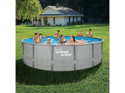 Summer Waves Elite Frame medence 488 x 122 cm, természetes rattan színben. Az Elite Frame medence külseje világosszürke rattan mintázatú, a keretek szintén szürkék. A medence egyszerűen és gyorsan felállítható, szerkezete pedig stabil. Tartalom: A medence mérete: 488 cm x 122 cm, Víztartalom: 19 858 liter (90% megtöltve), 45 perc alatt készen áll a víz befogadására, Mozaik mintás belső felület, Patronos szűrő szivattyú 5300 liter/óra; friss és tiszta vizet biztosít, A szűrőpatron (A/C típus) két hetente cserélendő, könnyen felszerelhető és karbantartható, SureStep lépcső: erős, könnyű acélvázzal és masszív műanyag lépcsőkkel. Alátét a medence aljának védelmére. Védőtakaró a levelek és a külső szennyeződések ellen. Medence karbantartó készlet: tartalmazza a porszívófejet, a merítőhálót, és a teleszkópos alumínium rudat.