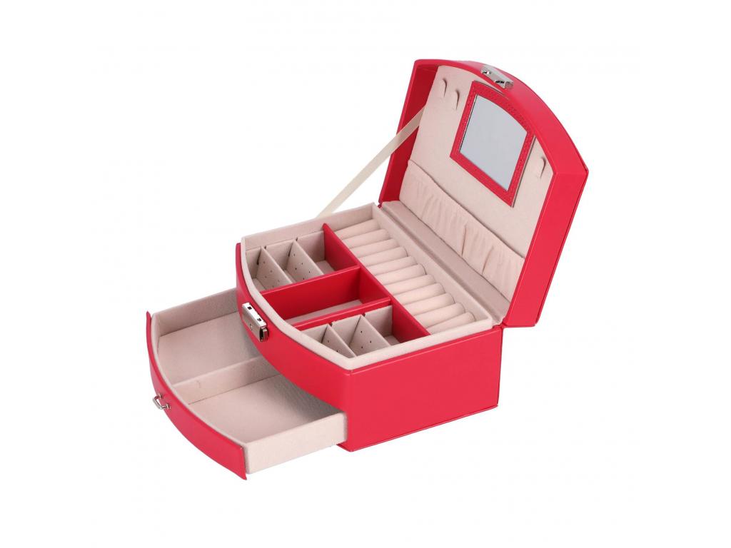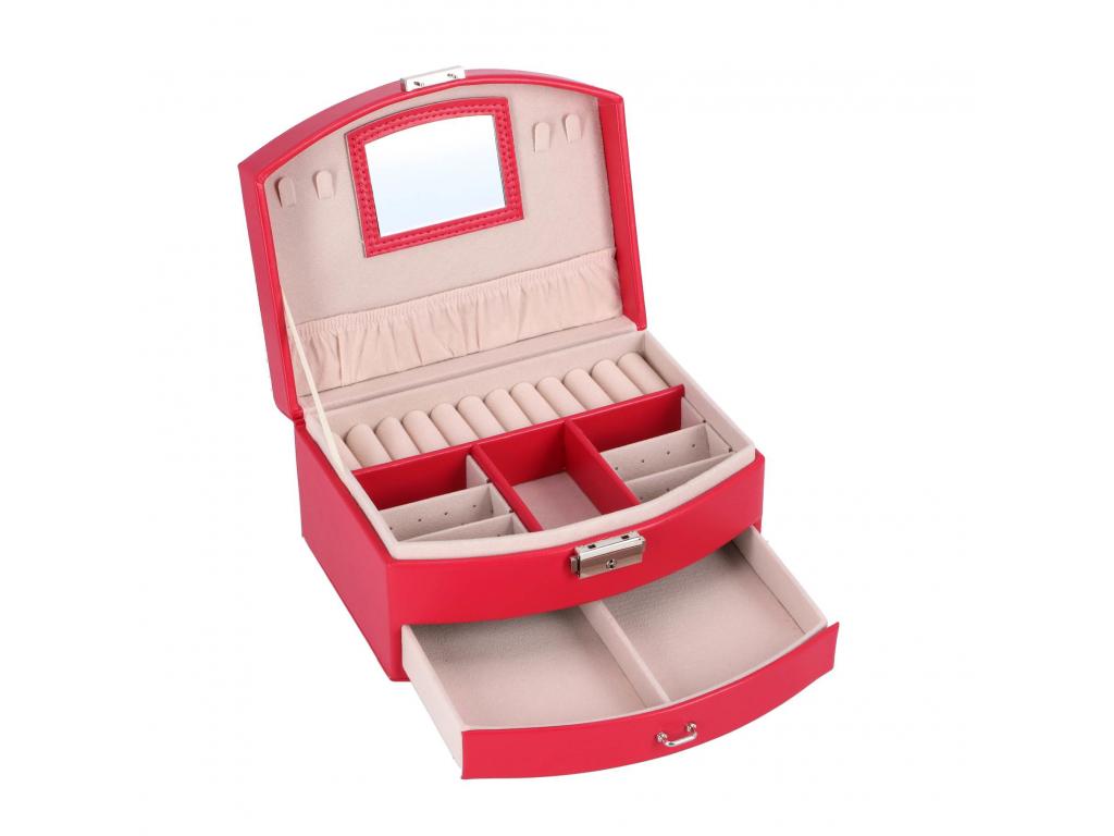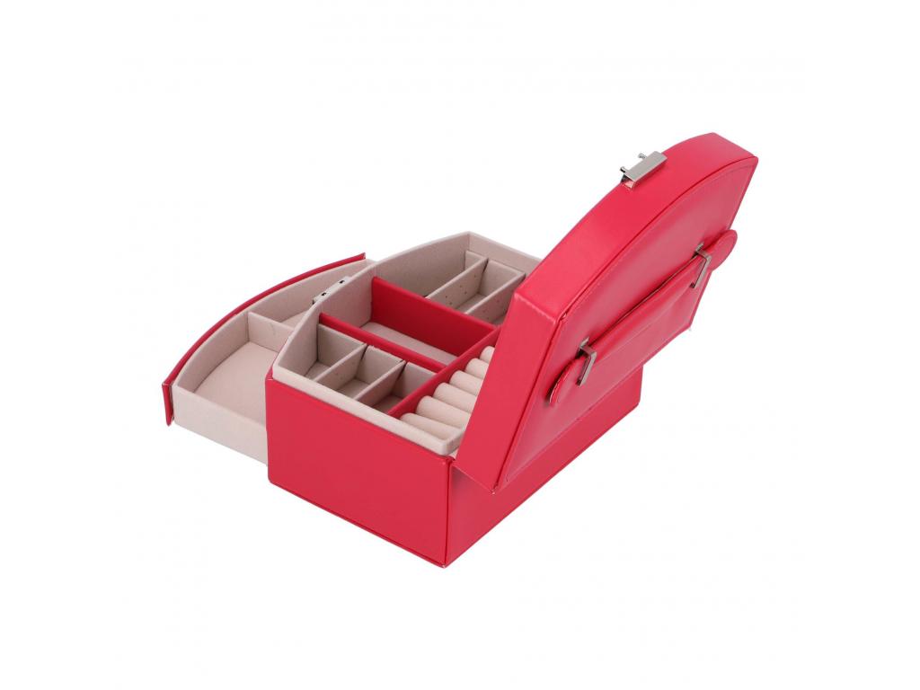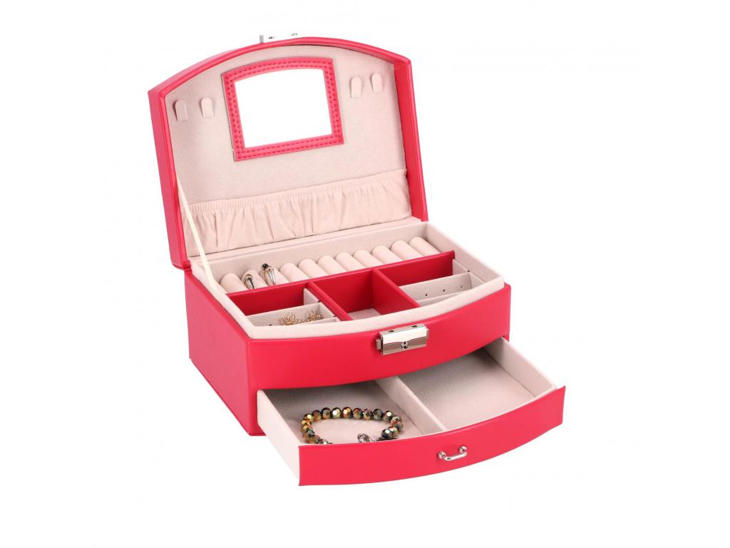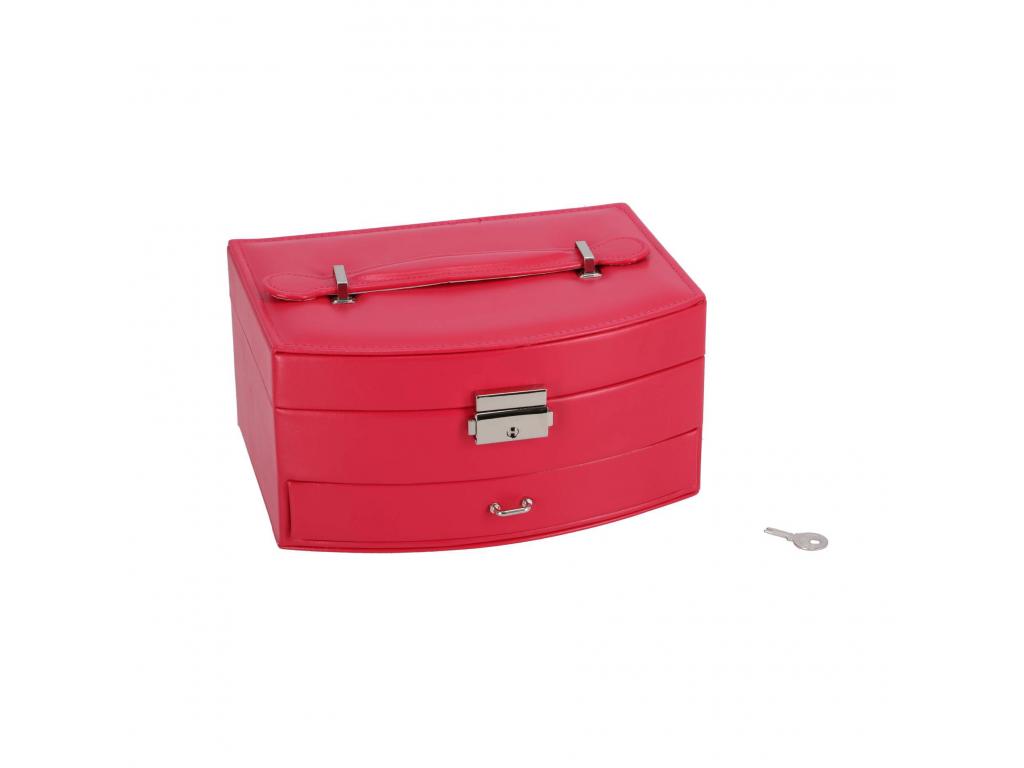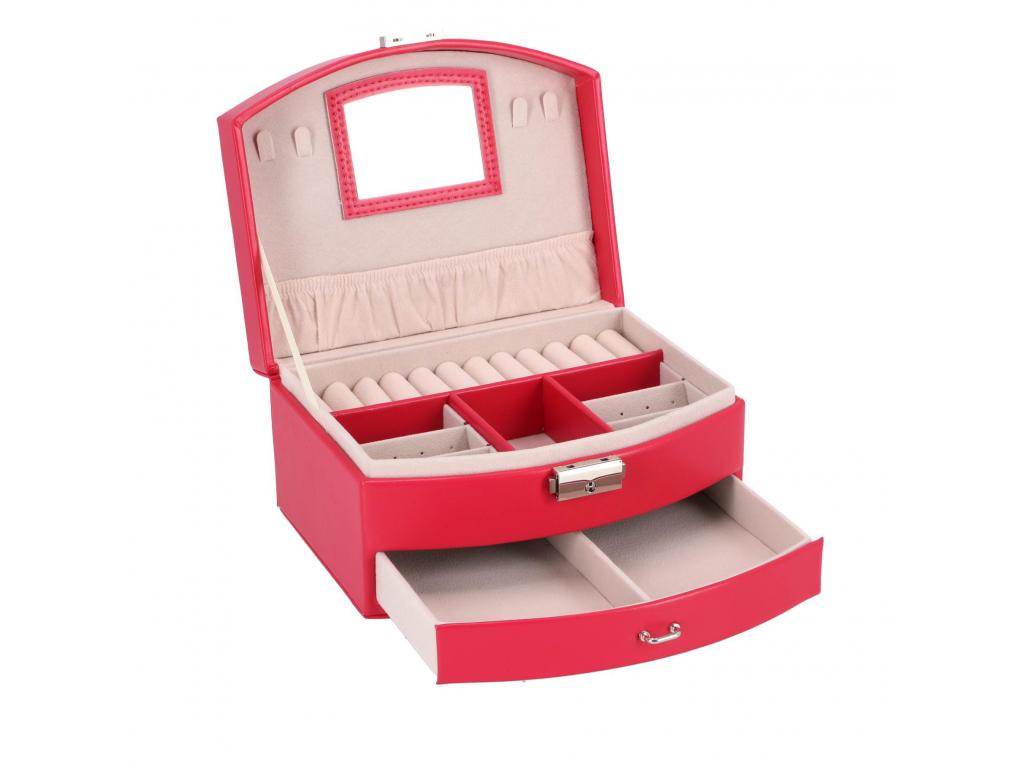 Rózsaszín műbőr ékszerdoboz. Belsejében tükör, akasztók, különböző (állítható) tárolórekeszek és egy külön fiók található, amely még több tárolási lehetőséget kínál. 3 éves kortól alkalmas.