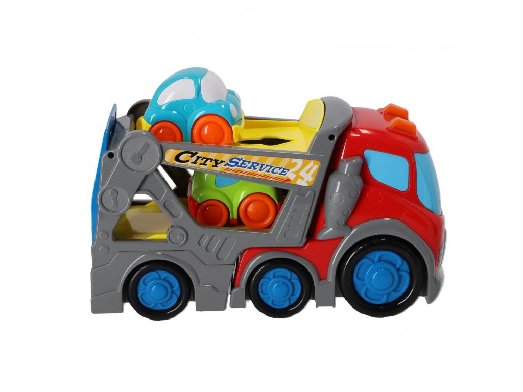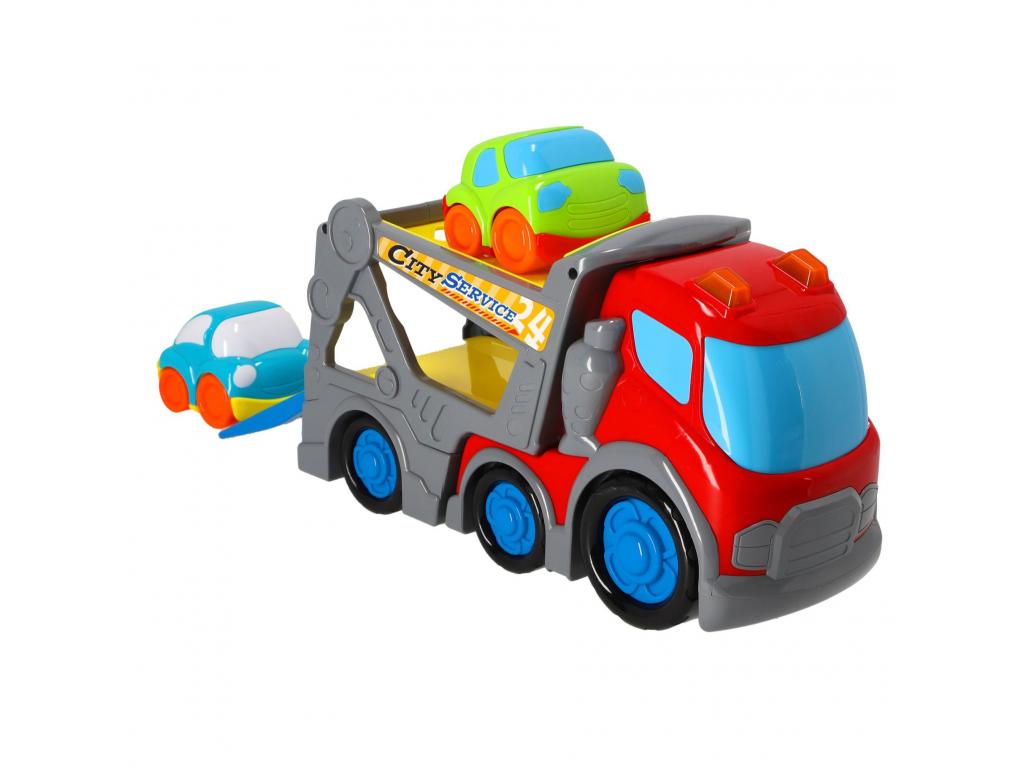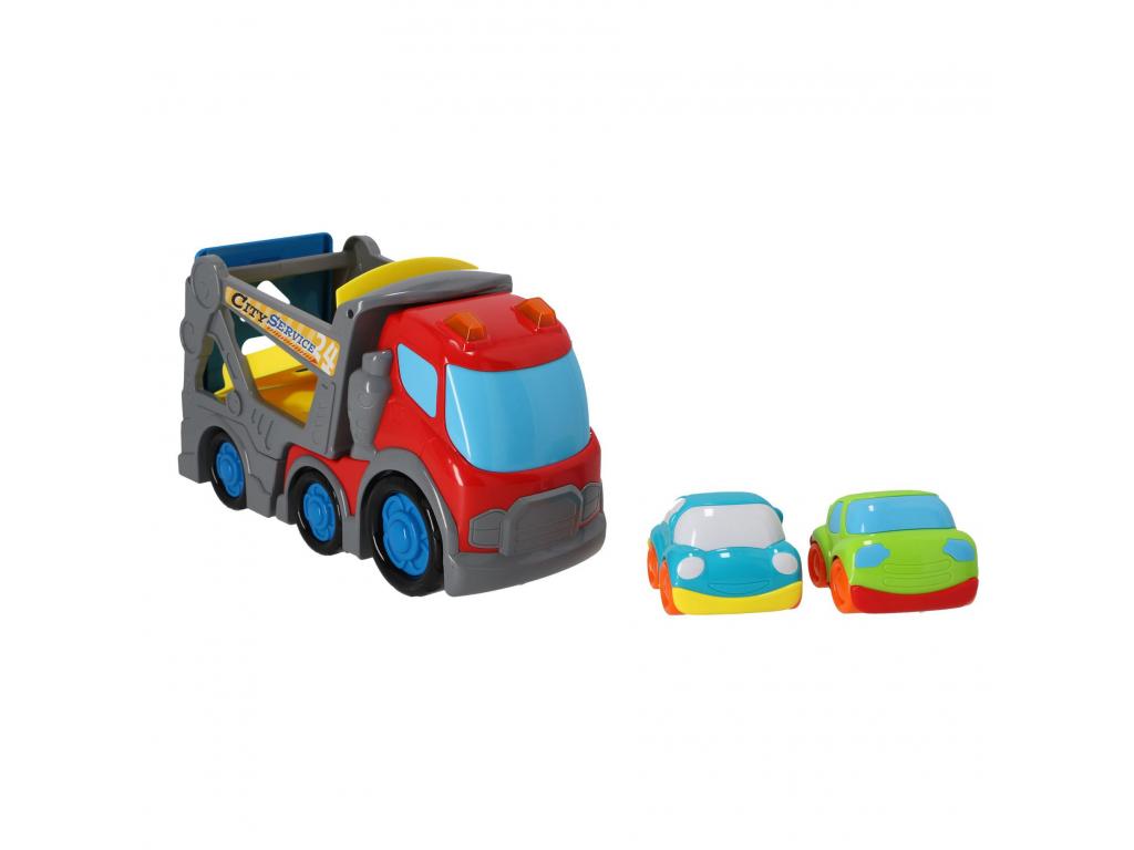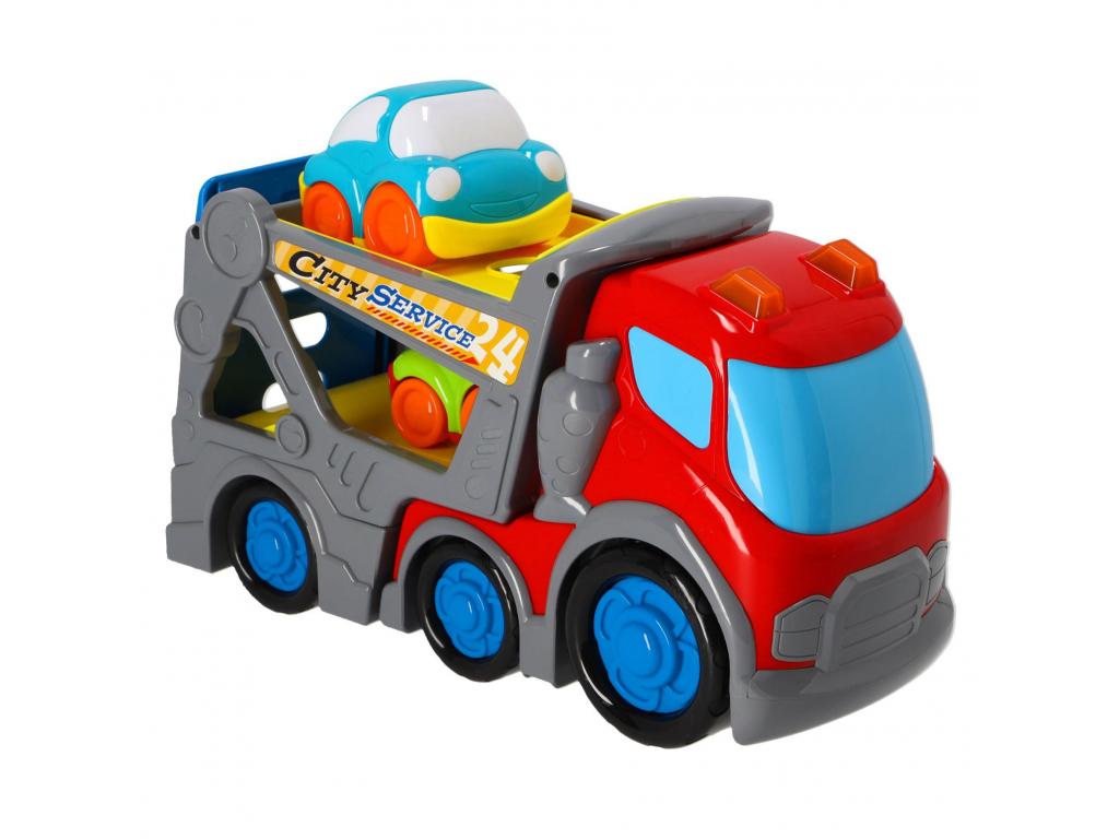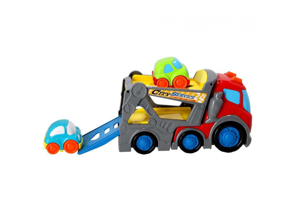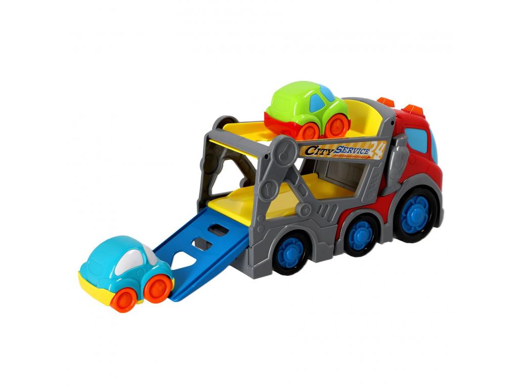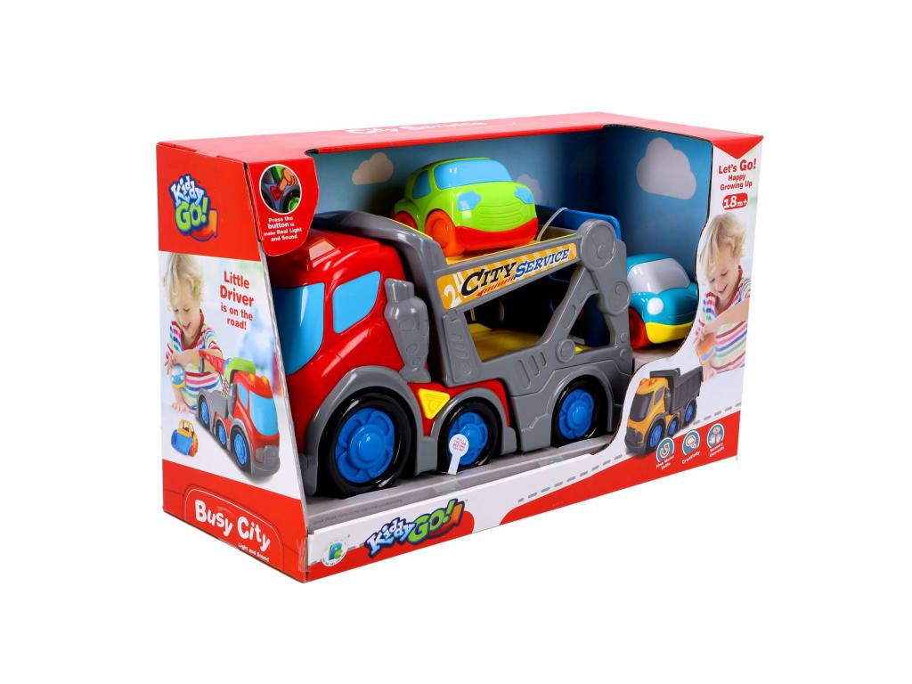 KiddyGo autószállító 31 cm-es, fény- és hanghatásokkal. 31 cm-es, erős műanyagból készült szállító, 2 kis autóval kiegészítve. A szállító látványos fény- és hanghatásokkal rendelkezik, amelyek lenyűgözik a gyerekeket. Fejleszti a kisgyerekek motorikus képességeit, érzékszerveit és kreativitását. 18 hónapos kortól alkalmas.