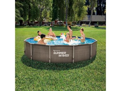 Summer Waves medence Active Frame 366 x 76 cm, barna rattan fonat színben. A medence külseje sötétbarna rattan mintázatú, a keretek szintén barnák. A medence egyszerűen és gyorsan felállítható, és szilárd szerkezetű. Tartalom: A medence mérete: 366 cm x 76 cm, Víztartalom: 6950 liter (90% megtöltve), 30 perc alatt készen áll a vízzel való feltöltésre, Mozaik mintás belső felület, Patronos szűrő szivattyú 1249 liter/óra; friss és tiszta vizet biztosít, A szűrőpatron (I. típus) két hetente cserélendő, könnyen felszerelhető és karbantartható.