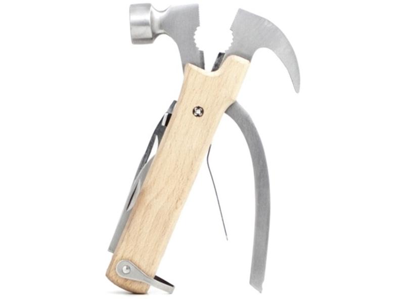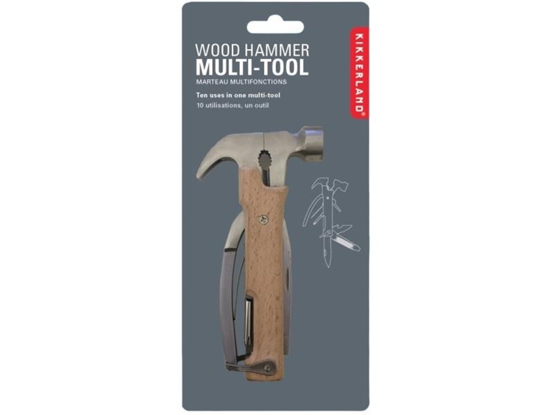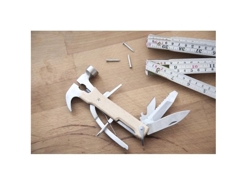 A Kikkerland fa nyelű multifunkciós kalapács és szerszámkészlet leírása: Ez a fa-markolatú multifunkciós kalapács szerszámkészlet 10 szerszámból áll: kalapács, laposfejű csavarhúzó, üvegnyitó, dörzsár, fűrész, kés, csillagfejű csavarhúzó, fogó és drótvágó.