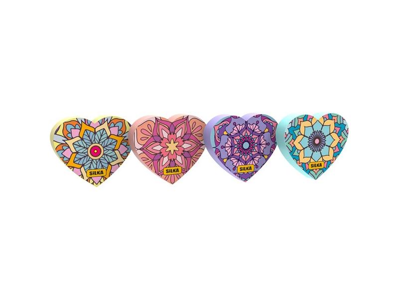 Mandalás, szív alakú radír műanyag dobozban. Anyaga TPR (hőre lágyuló gumi), PVC mentes, forgácsmentes. Élelmiszer minőségű festékanyagokkal gyártva. Ideális grafit ceruzavonalak radírozásához. Mérete 40x35x9 mm. A minta nem választható.