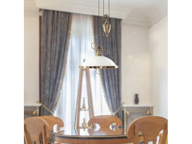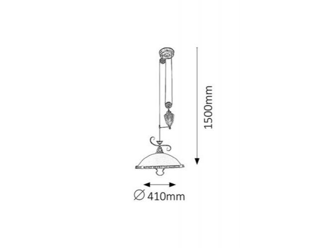 Klasszikus megjelenésű csillár 1 darab foglalattal, ellensúlyos, állítható lelógású kivitelben. 41 cm átmérőjű, max 150 cm hosszúságú, bronz színű fémből készített lámpatest és fehér színű üveg lámpabúra, IP20-as védelemmel. A lámpatest E27-es foglalatú, max. 60W teljesítményű, halogén vagy energiatakarékos fényforrással is használható.