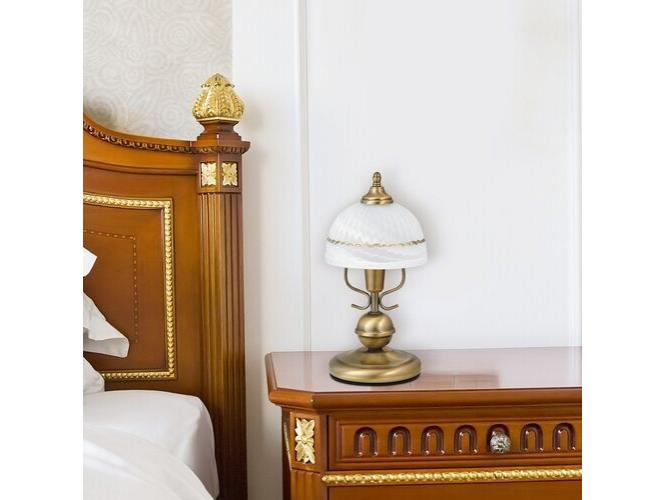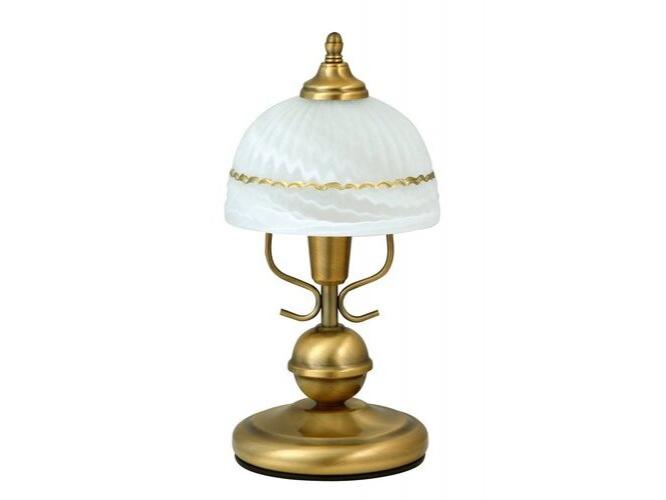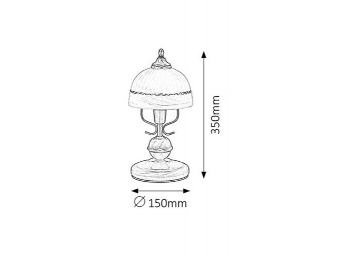 Klasszikus megjelenésű éjjeli lámpa 1 db foglalattal. 32 cm magas, bronz színű fémből készített lámpatest 16 cm átmérőjű, diszkrét bronz mintás, fehér opálüveg búrával. A lámpatest E14-es foglalatú, max. 40W teljesítményű halogén vagy energiatakarékos fényforrással használható.