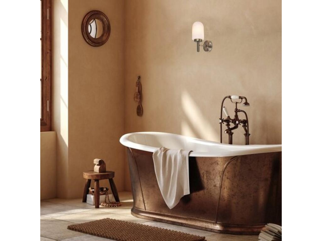 A Zenkai fürdőszobai fali lámpa a Rábalux saját tervezésű modellje, amely hangulatos és elegáns világítási megoldást kínál modern fürdőszobánkba. A fémből készült, bronzszínű lámpát felül lekerekített, henger alakú, fehér üvegbúra egészíti ki, és kisméretű, kerek dísztalp segítségével rögzíthető a falra. A bronzszínű dísztalpból merőlegesen kinyúló kar egy T formájú elemhez kapcsolódik, amely fáklyatartóhoz hasonlóan hordozza a lámpafejet. A fali lámpa egy darab legfeljebb 10 W teljesítményű fényforrással használható, a foglalat típusa E14. A modern, tiszta hatás érdekében érdemes a lámpához természetes fehér fényű izzót választani. A Zenkai IP44-es védettsége garantálja, hogy a lámpa 1 mm-nél nagyobb szilárd tárgyak behatolása ellen, valamint bármilyen irányból fröccsenő víz ellen védett. A fürdőszobai lámpa méretei a következők: magassága 255 mm, faltól mért távolsága 160 mm, a búra átmérője 100 mm, beépítési átmérője 100 mm. Ezt a modellt fényforrás nélkül szállítjuk.