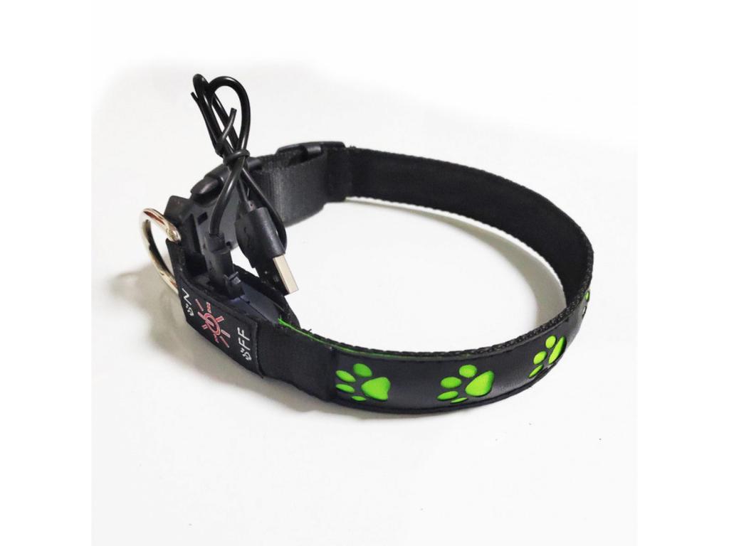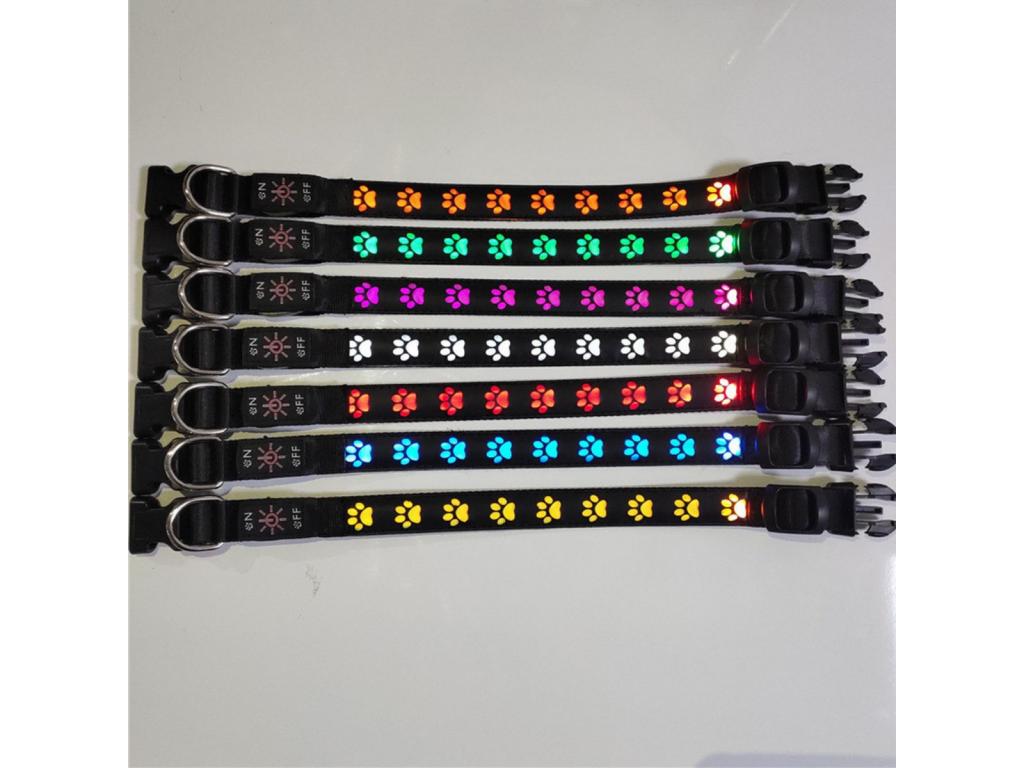 A LED-es kutyanyakörv , állítható , USB , tölthető , vízálló , 35cm , S-es , tappancsos, kék leírása: