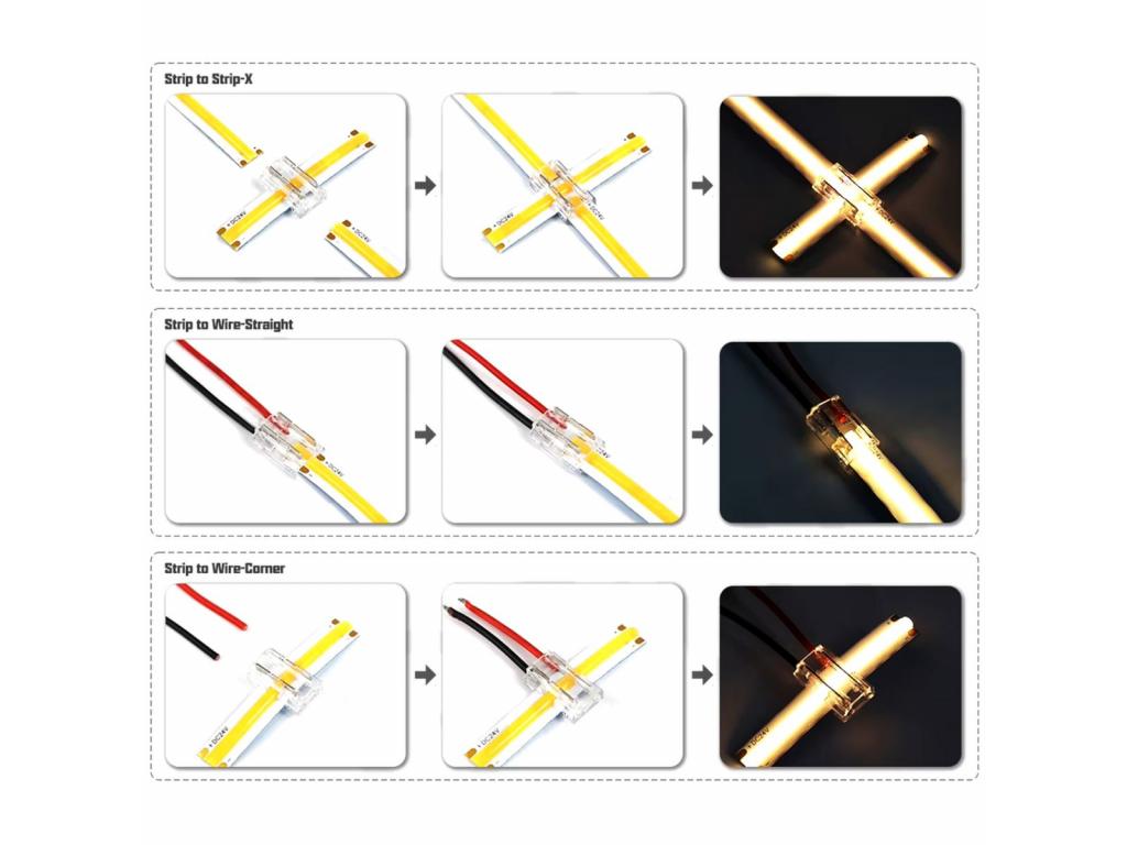 A 9 az 1-ben COB LED szalag gyorscsatlakozó ideális választás mindazok számára, akik egyszerűen és megbízhatóan szeretnék összekapcsolni LED szalagjaikat. Ez a csatlakozó lehetővé teszi kilenc különböző csatlakozási mód alkalmazását, beleértve az egyenes, L-alakú, T-alakú és X-alakú összekötéseket, valamint a szalag-szalag és szalag-vezeték kapcsolásokat. A forrasztásmentes kialakításnak köszönhetően nincs szükség speciális szerszámokra vagy technikai ismeretekre, így kezdők és szakemberek számára egyaránt ideális választás.