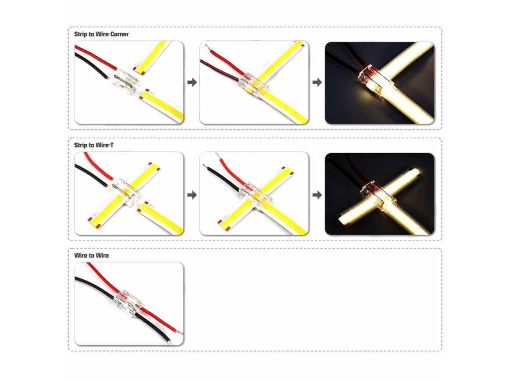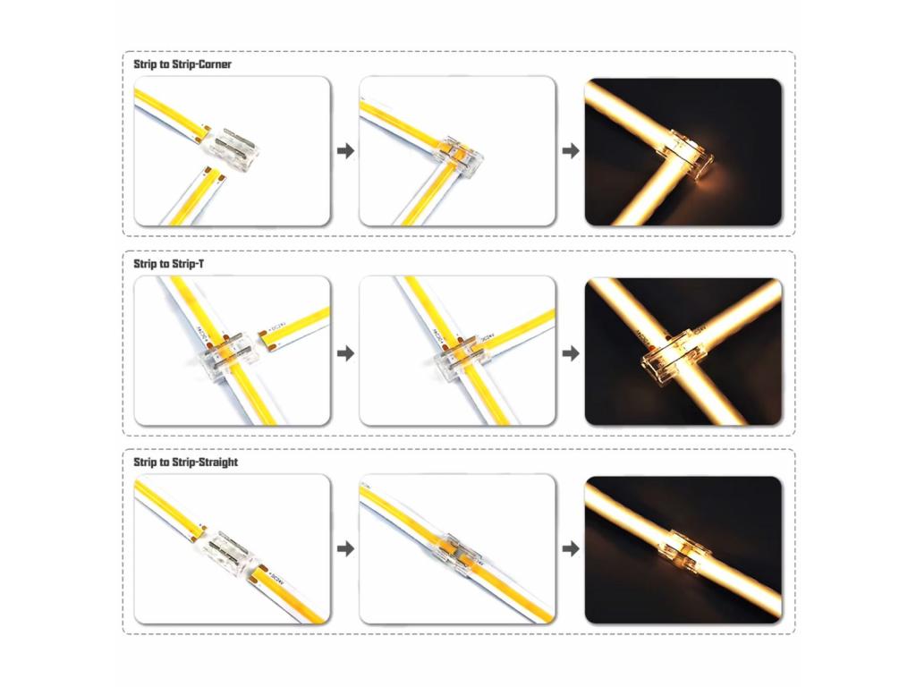 Ez a csatlakozó ideális választás DIY LED világítási projektekhez, konyhapult alatti világításhoz, dekorációs fényekhez és egyéb világítási megoldásokhoz. Egyszerű használatával és sokoldalúságával megkönnyíti a LED szalagok telepítését és karbantartását.