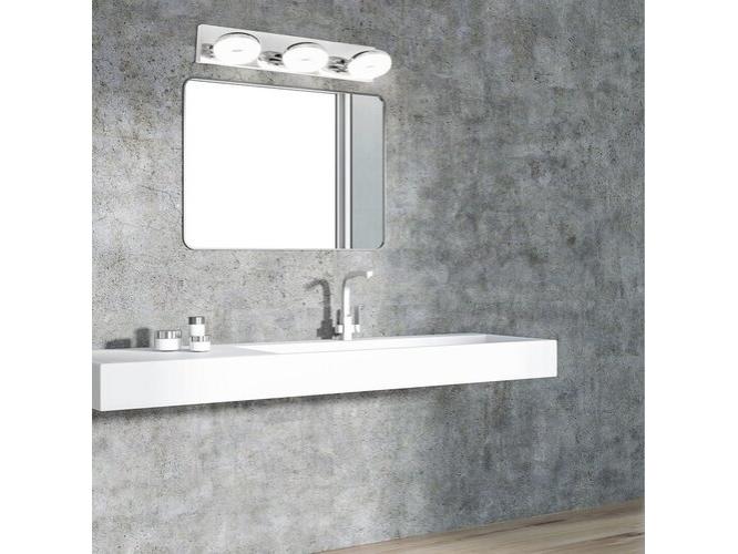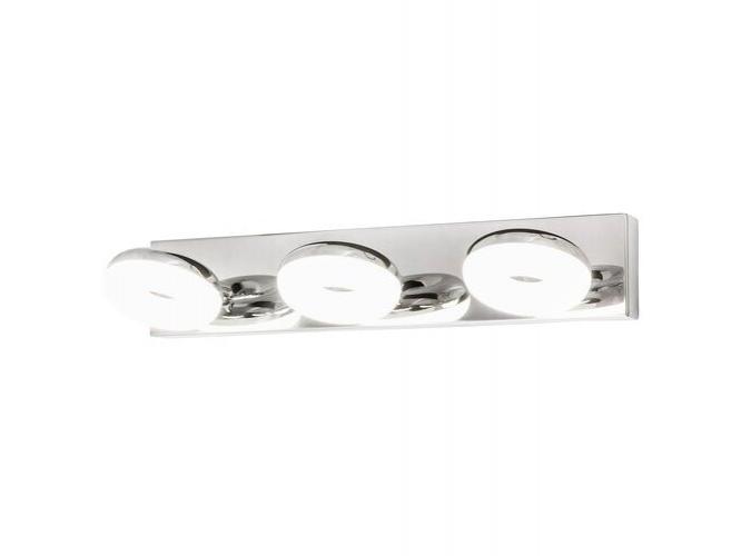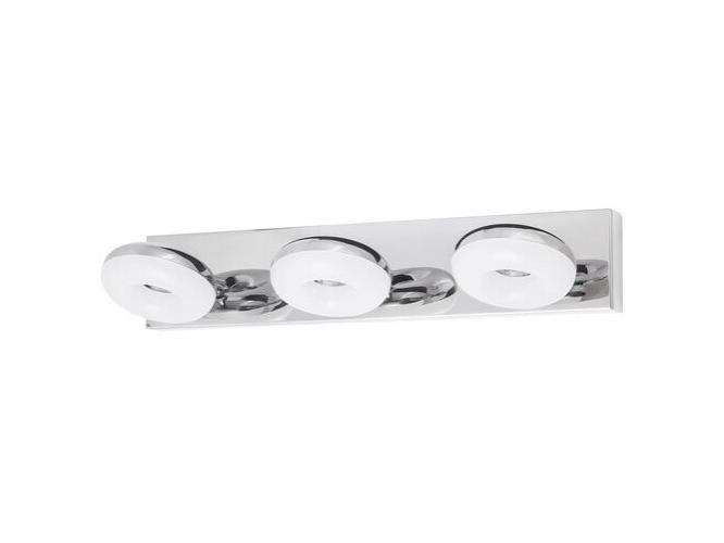Modern megjelenésű fürdőszobai fali lámpa beépített, energiatakarékos LED fényforrásokkal. 7,5 cm magas, 38,5 cm széles, króm színű, fémből készített lámpatest és fehér színű, műanyag lámpabúrák, IP44-es védettséggel. A beépített LED fényforrások 3x 5W teljesítmény mellett 3x 465 lumenes fényerőt és 4000 Kelvines, természetes fehér színű fényt kínálnak. 5 év garanciával. A lámpatestbe beépített fényforrások nem cserélhetők.
