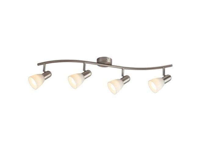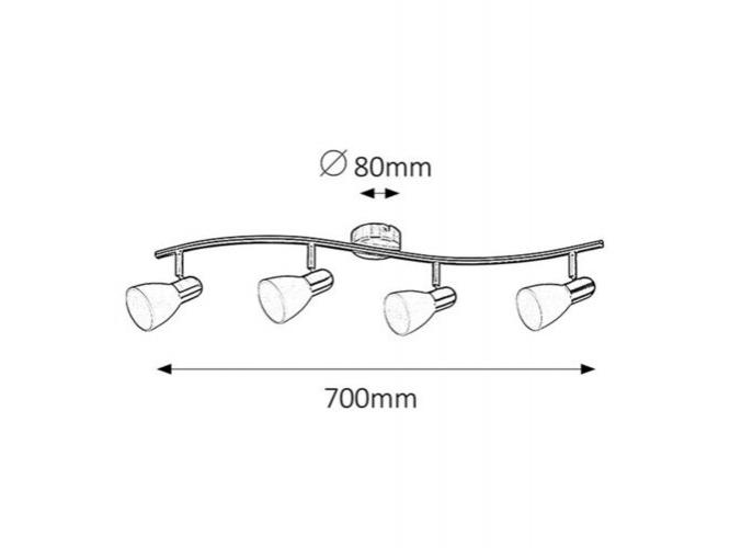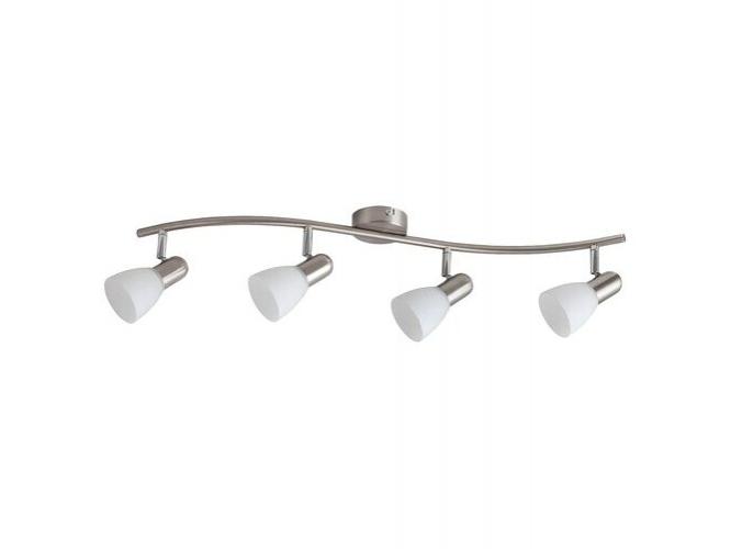 Időtlen stílusú spotlámpa, 4 darab foglalattal. 70 cm széles, szatin króm színű fém szerkezet és pozícionálható, fehér színű üvegbúrák, IP20-as védelemmel. A lámpatest E14-es foglalatú, max. 4x 40W teljesítményű, halogén vagy energiatakarékos fényforrásokkal is működtethető.