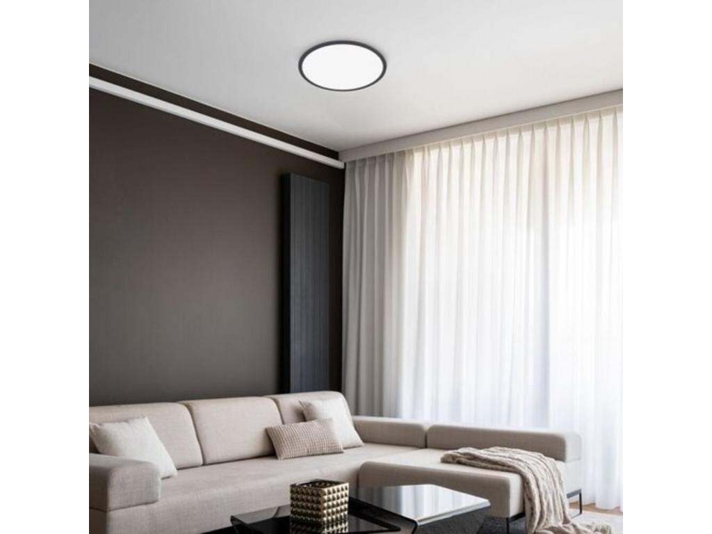 A nagyméretű, kerek Ezio ráépíthető mennyezeti lámpát azoknak ajánljuk, akik kedvelik a letisztult formavilágot extra funkciókkal ötvöző okos modelleket. A matt fekete színű, teljes egészében műanyagból, matt fehér búrával készült lámpa remek választás lehet a nappaliba vagy a hálószobába. Az Ezio az F energiaosztályba tartozó beépített LED fényforrással rendelkezik, amelynek a teljesítménye 36 W, fényereje búrával 3600 lumen, búra nélkül 4800 lumen, élettartama pedig 15 000 óra. A mennyezeti lámpa színhőmérséklete 3000 K, azaz meleg fehér fénnyel világít. Ez különösen alkalmassá teszi a hálószobai használatra, ahol elősegíti az otthonos, meghitt hangulat megteremtését. Ráadásul az Ezio fali kapcsolóval három lépésben dimmelhető, azaz fényereje szabályozható. Ezenkívül memória funkcióval is rendelkezik, amely kapcsoló segítségével állítható. A mennyezeti lámpa átmérője 540 mm, mennyezettől mért távolsága pedig mindössze 25 mm.