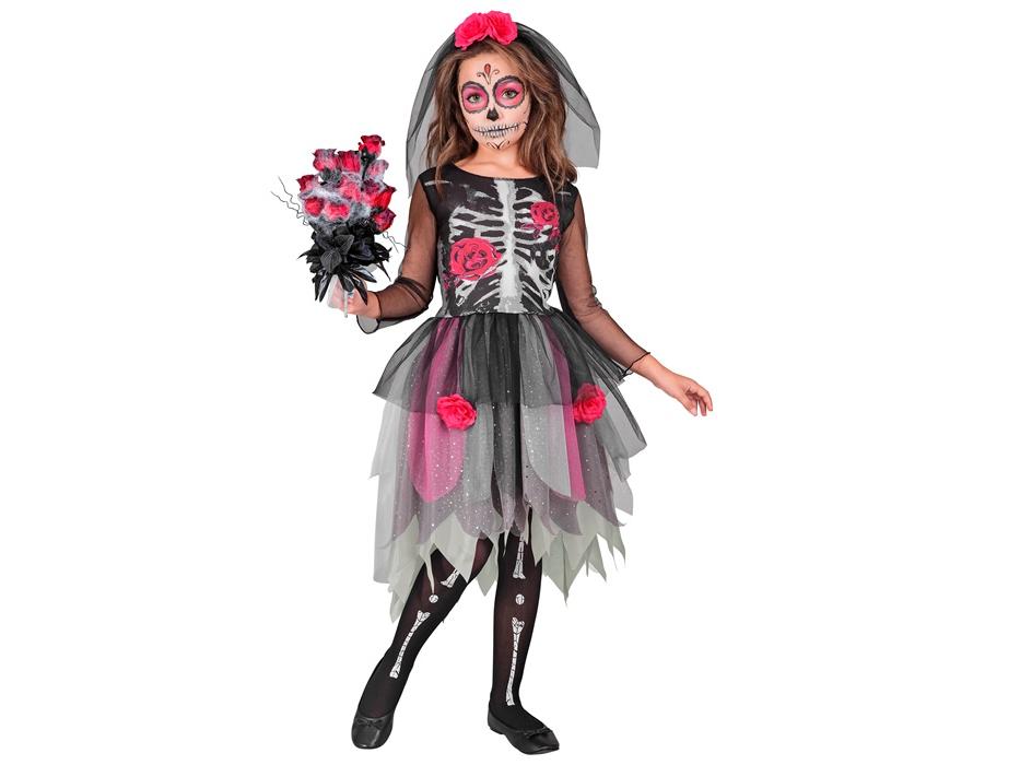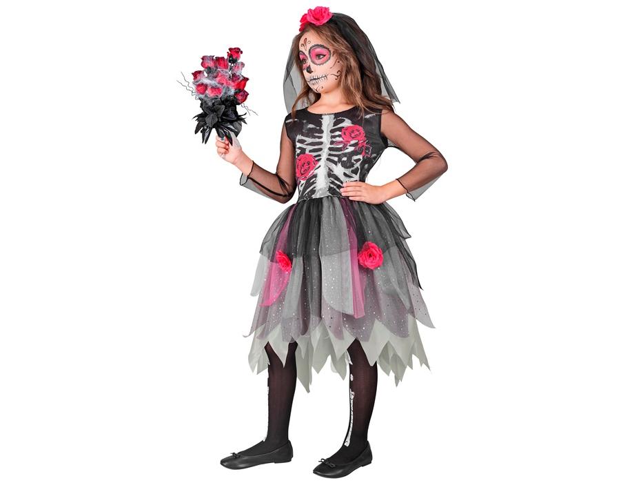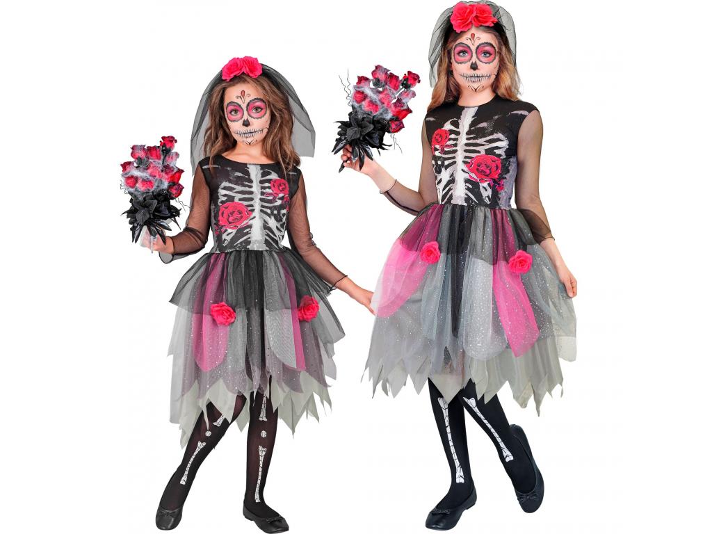 Kedves kis virágos csontváz jelmez, igazi Halloween ruha ruha és hajdísz