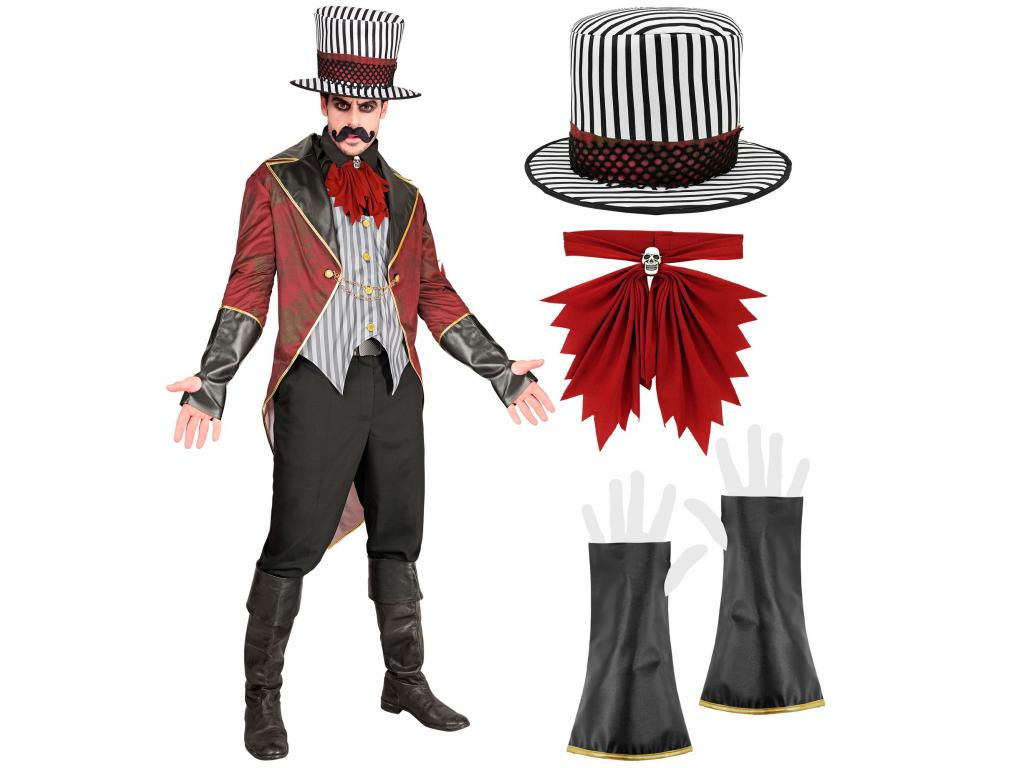 Gatdagon kiegészítőkkel ellátott cirkuszigazgatói ruha Frakk mellénnyel, bot koponyával, kesztyű, kalap