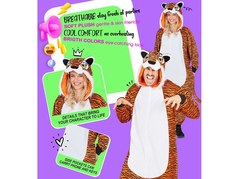 A Tigris puha plüss egyberészes unisex felnőtt jelmez leírása: