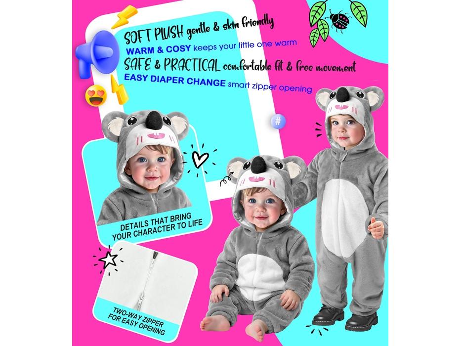 A Koala puha plüss kapucnis overál unisex gyermek jelmez leírása: