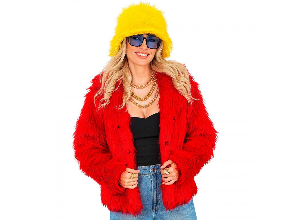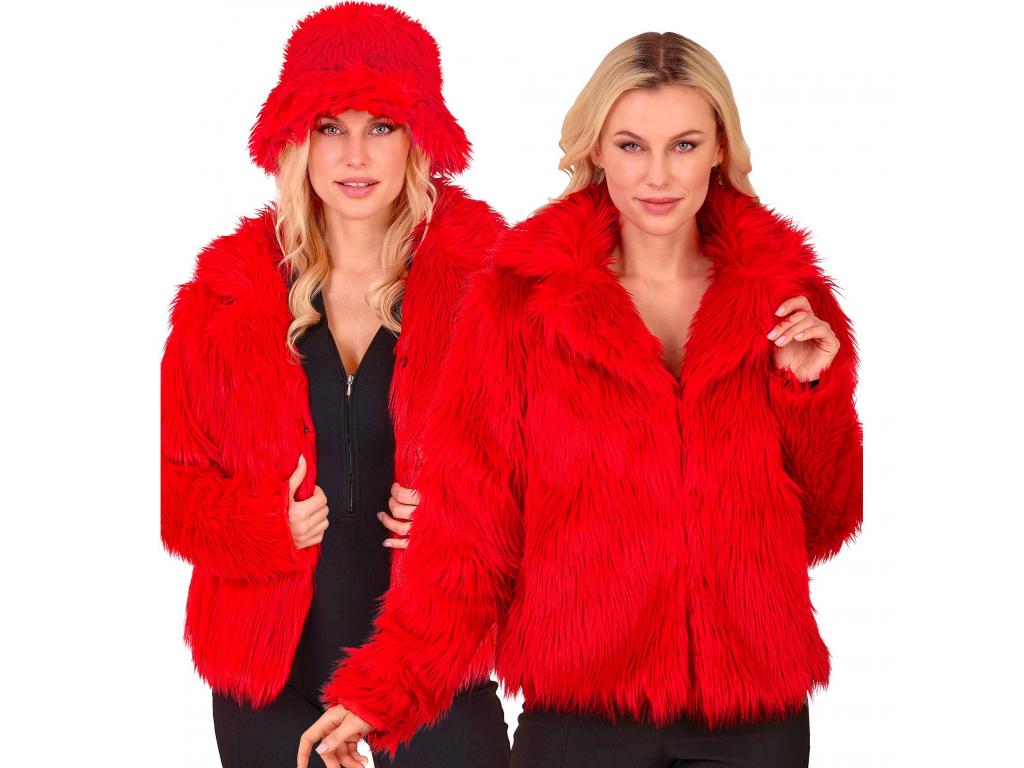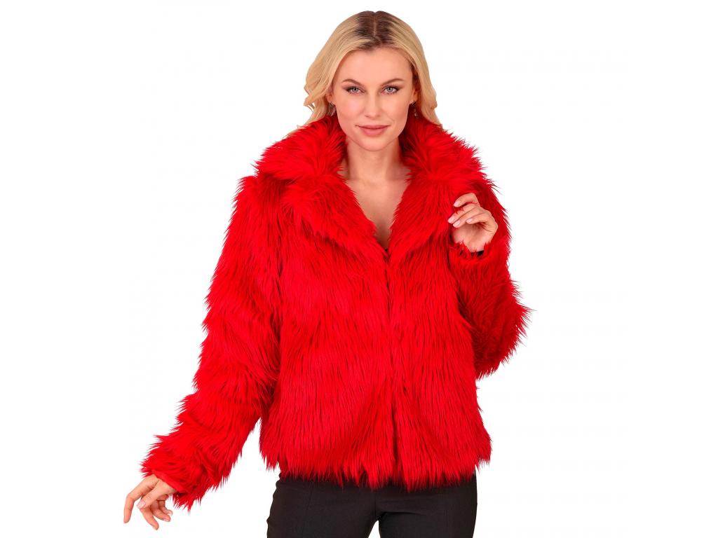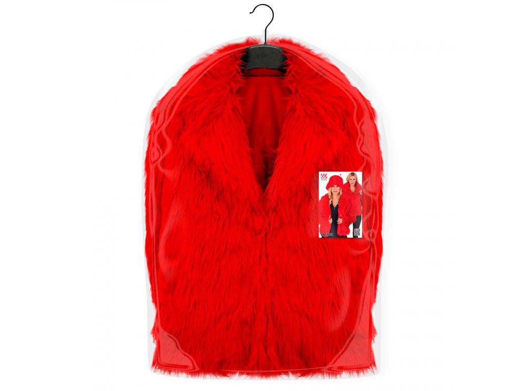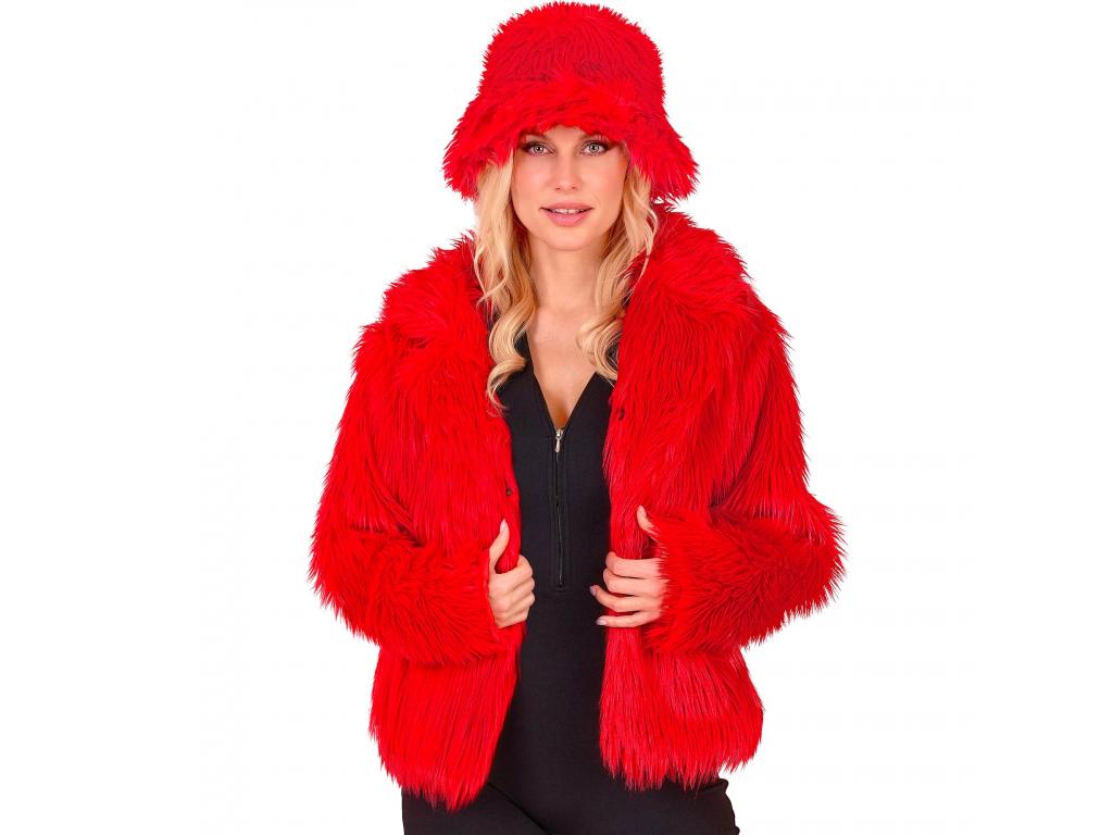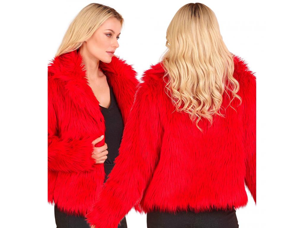 A Piros színű plüss szőrös kabát női jelmez leírása:
