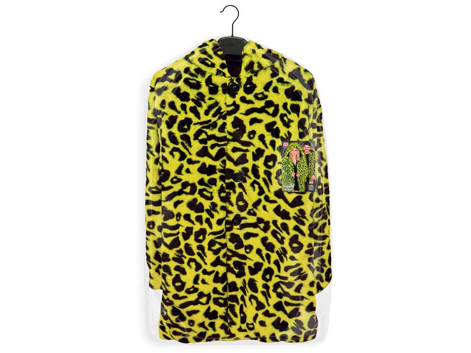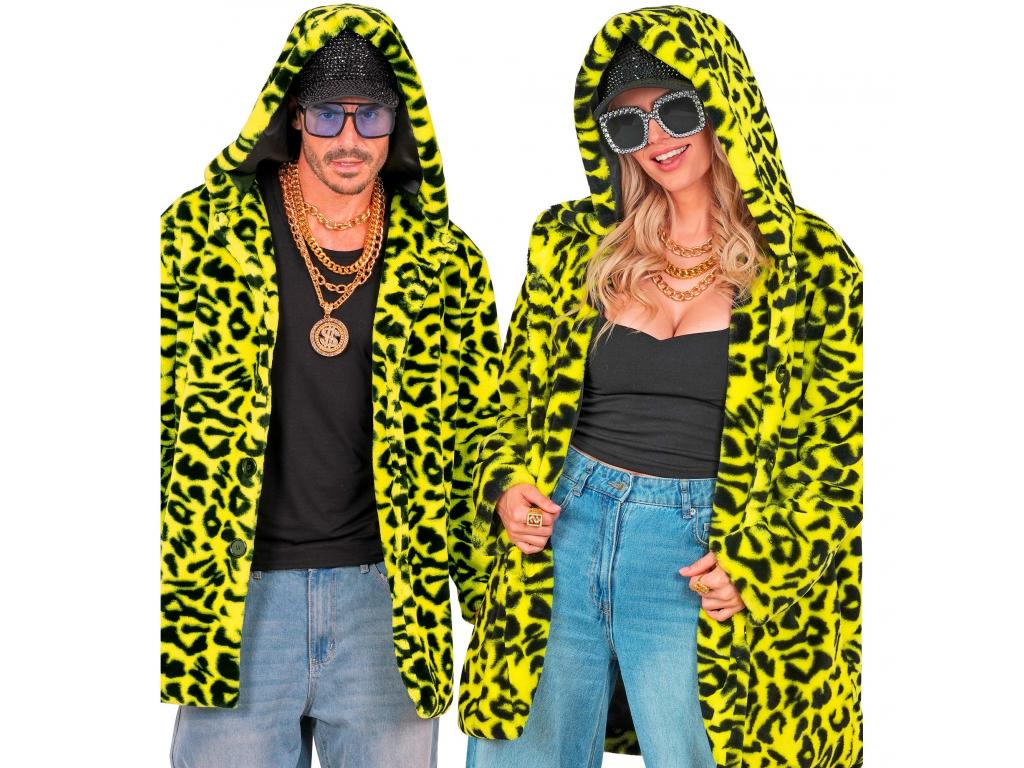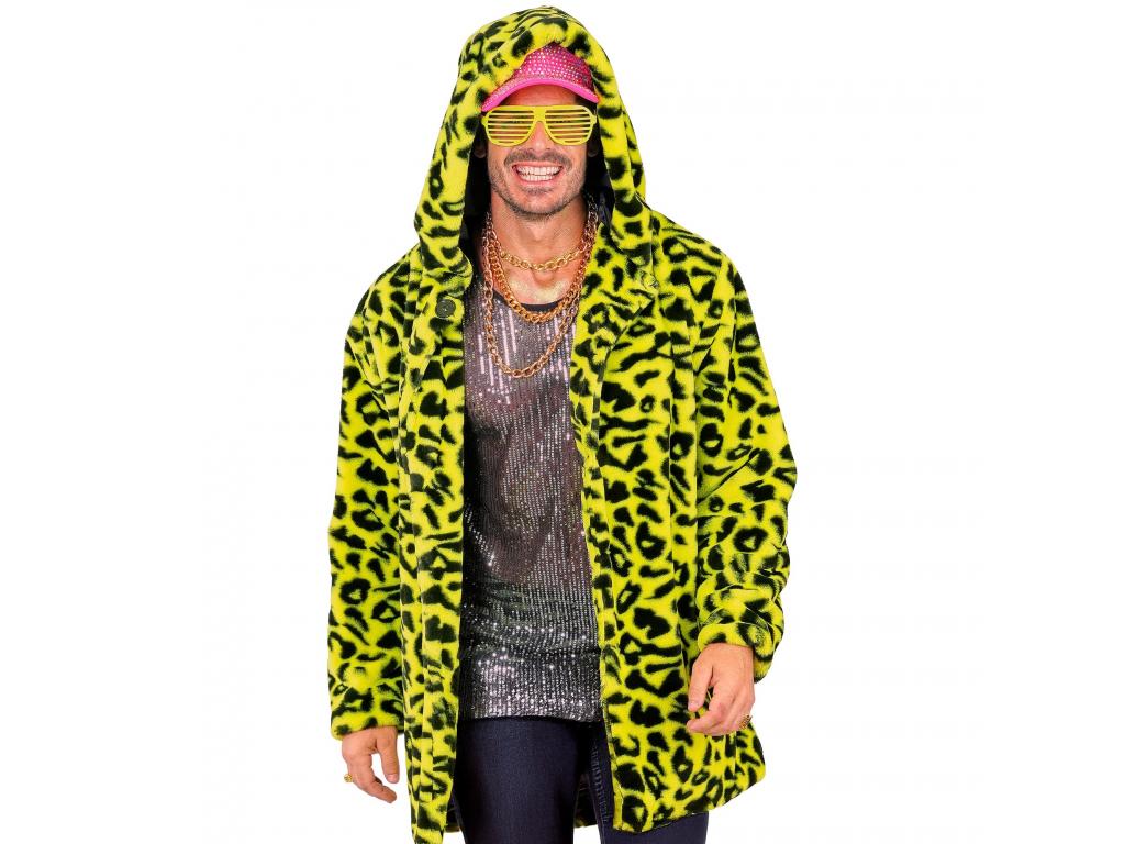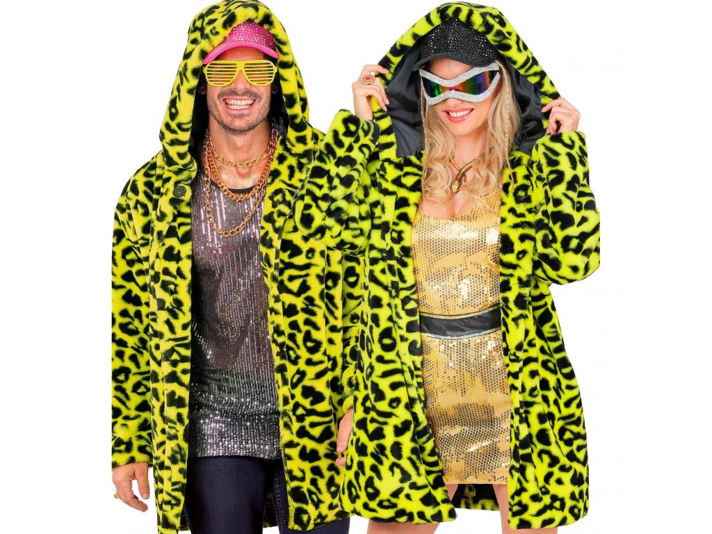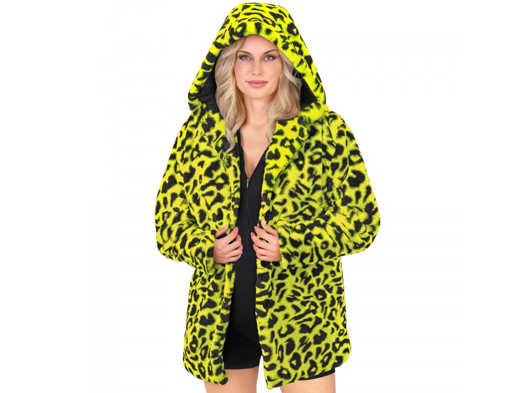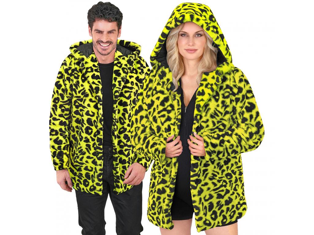 A Leopárdmintás neon sárga plüss kapucnis dzseki unisex felnőtt jelmez leírása: