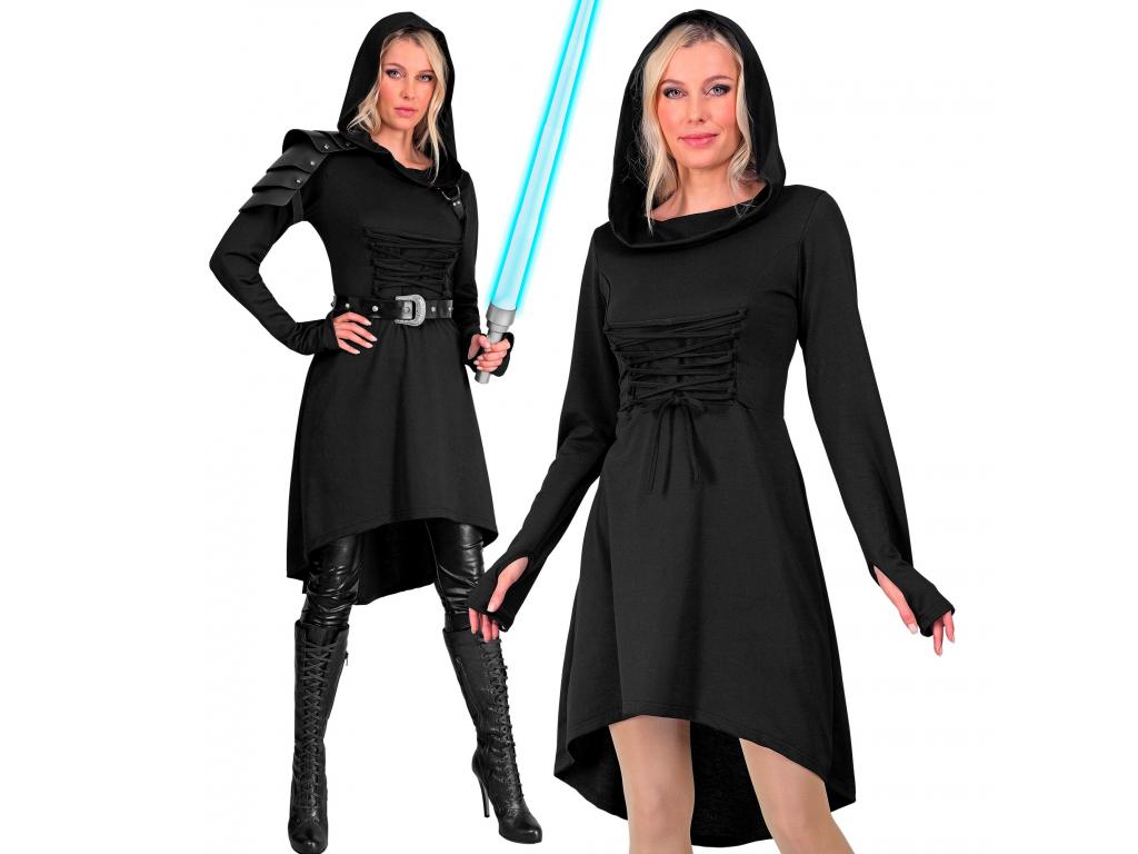 Középkori idők női ruhája, elől fűzővel és kapucnival. A ruha hosszúujjú. ruha kapucnival