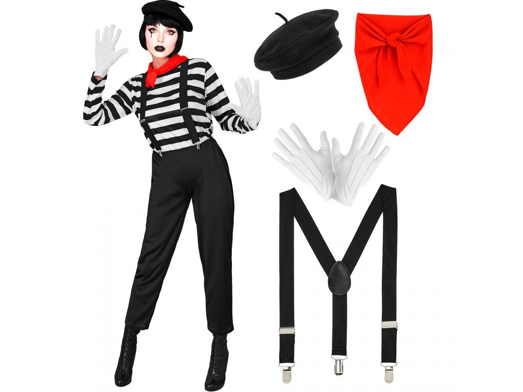 A pantomin nem egy könnyű mesterség, de egy kis gyakorlással biztos sikered lesz ebben a jelmezben felső, nadrág, nadrágtartó, sál, kesztyű, sapka