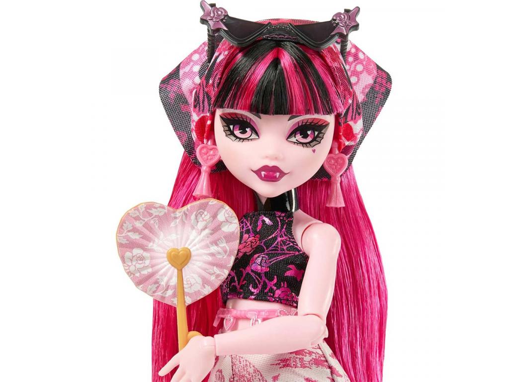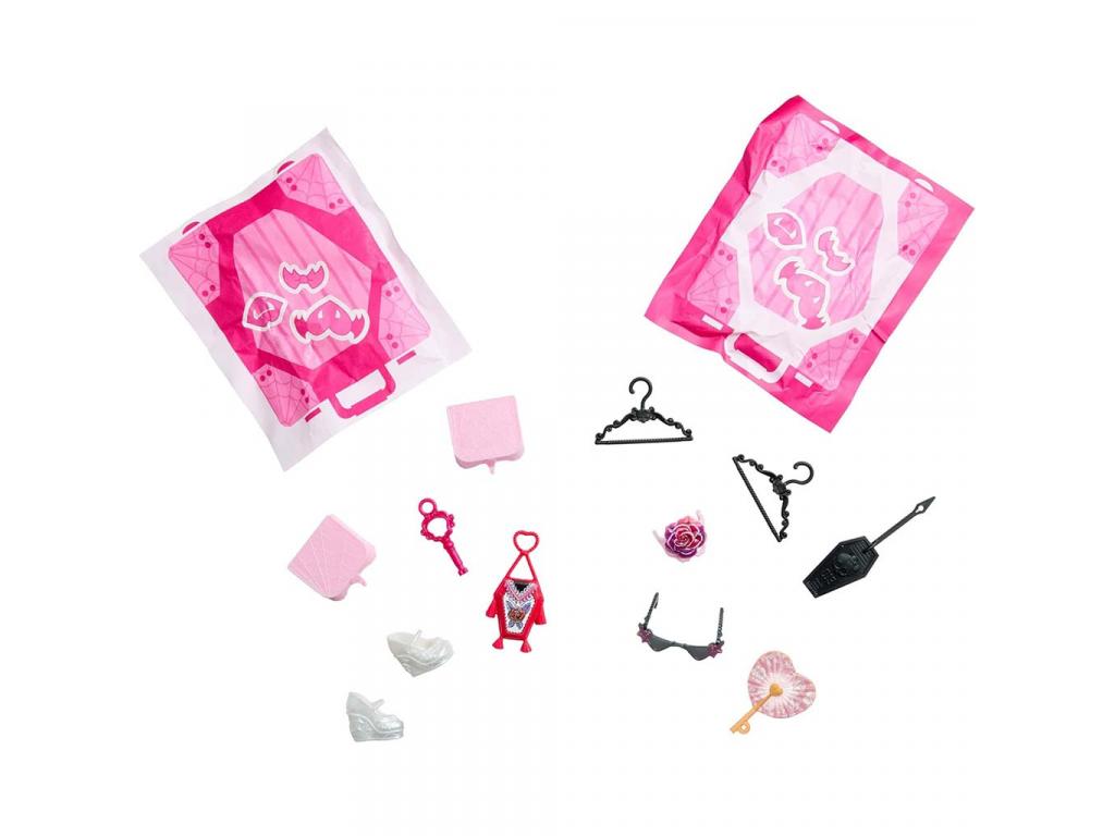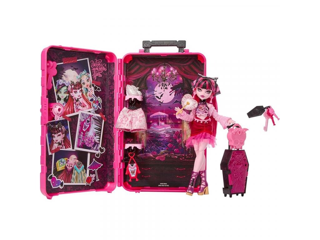 Draculaura ebben a szettben egy utazásra kész, mégis elbűvölően rémes megjelenést kapott. Rózsaszínfekete színvilágú ruhája, részletgazdag cipője és karakteres sminkje tökéletesen illik a Monster High világához. A baba hajformázása és arckifejezése különösen részletes, így a szerepjáték még élethűbb. A bőrönd belseje nemcsak tárolóként szolgál, hanem egy hangulatos, rémesen szép jelenetté is átalakul, ami inspirálja a történetmesélést és a fantáziadús játékot.